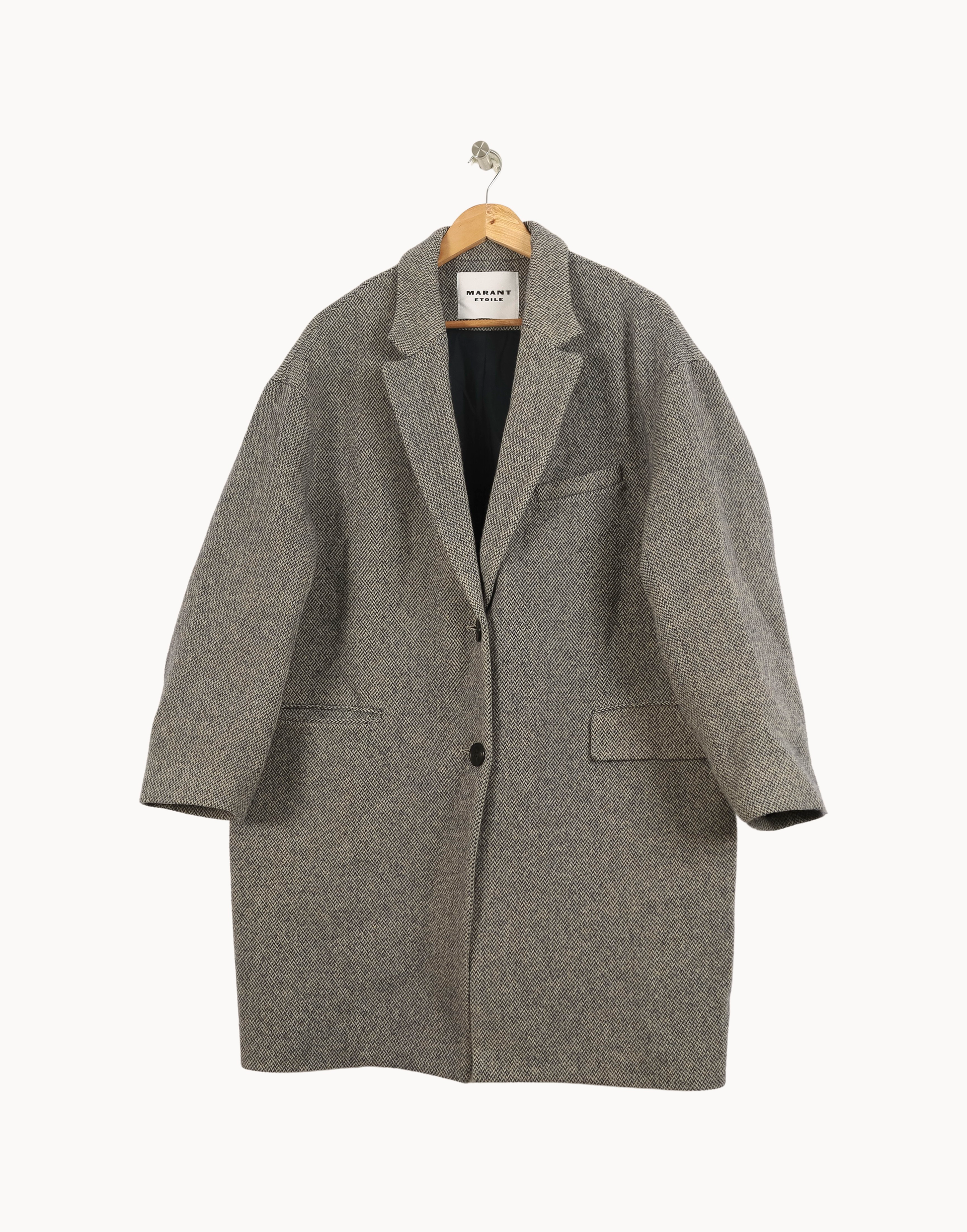 Manteau oversize Isabel Marant Étoile, taille M/38, aux teintes grises et noires, à manches longues et fermeture à bouton. Confectionné dans une matière texturée évoquant un motif chevron, il se distingue par son col tailleur classique, ses poches à rabat et sa coupe ample qui assure confort et élégance. Idéal pour une journée professionnelle en ville ou pour sublimer une tenue casual lors d’une sortie automnale.