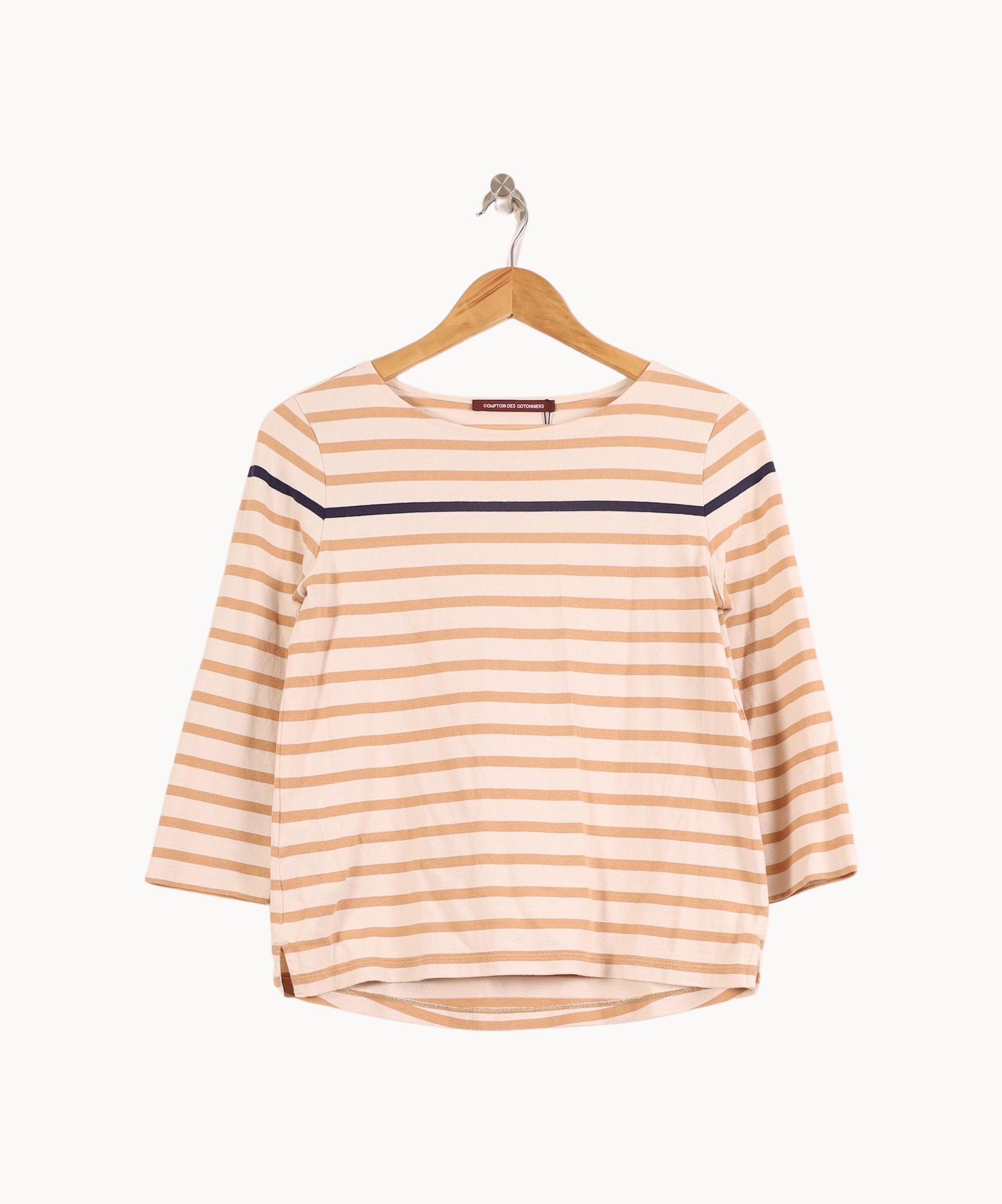 Top à rayures multicolores Comptoir des Cotonniers, taille S/36. Confectionné dans une matière douce au toucher, ce haut se distingue par ses manches trois-quarts et son motif à rayures beiges et bleu marine, apportant une touche moderne et élégante à une pièce intemporelle. Idéal pour une journée décontractée au bureau ou une sortie en ville, il saura égayer votre vestiaire quotidien.