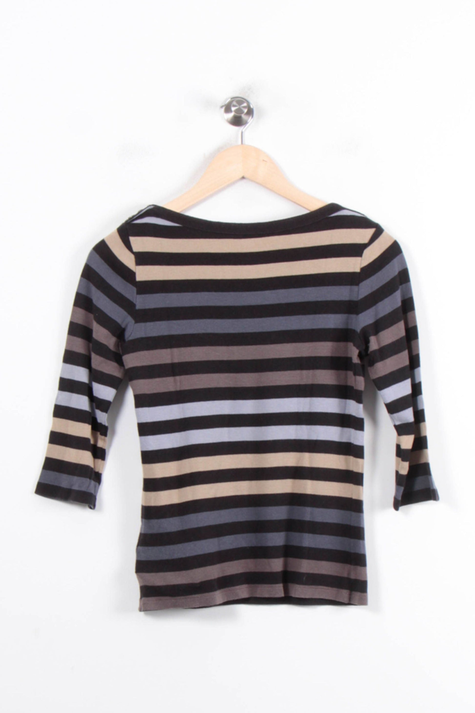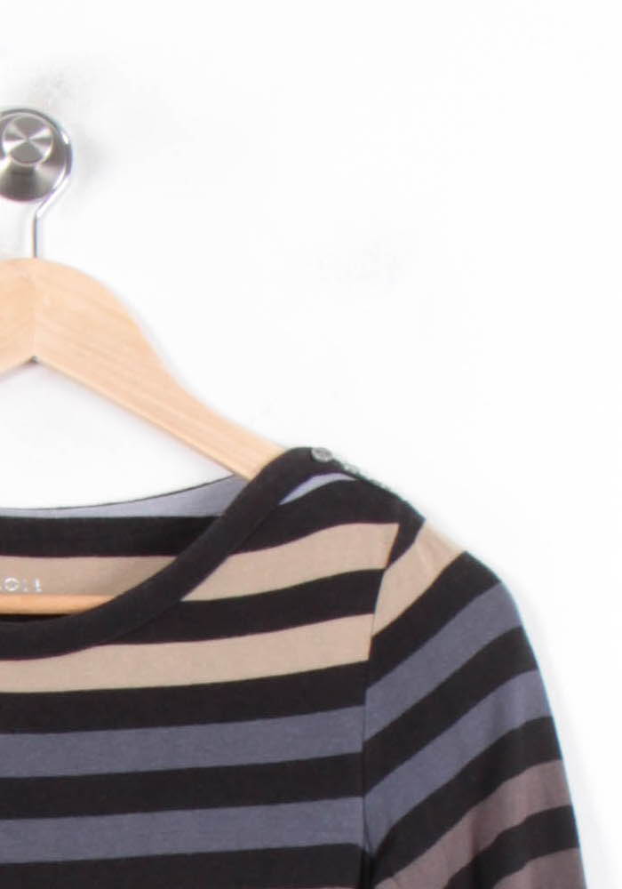 Top rayé multicolore Caroll en taille M/38, à manches trois-quarts, parfait pour une allure chic et décontractée. Confectionné dans une matière douce et agréable, ce top se distingue par ses rayures horizontales aux teintes sobres et ses boutons décoratifs sur l’épaule, apportant une touche d’originalité. Idéal pour une journée de travail ou une sortie en ville, associé à un pantalon élégant ou une jupe simple.