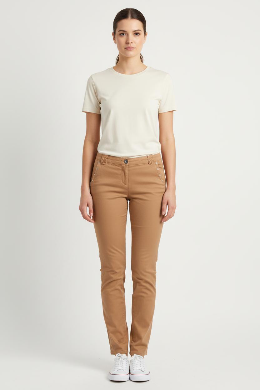 Pantalon slim beige femme IKKS taille XS/34, arborant une coupe élégante et moderne idéale pour sublimer la silhouette. Confectionné dans une matière douce, il se distingue par ses finitions métal aux poches, apportant une touche d’originalité tout en discrétion. Parfait pour une journée au bureau ou un déjeuner en terrasse, il vous accompagnera avec style au quotidien.
