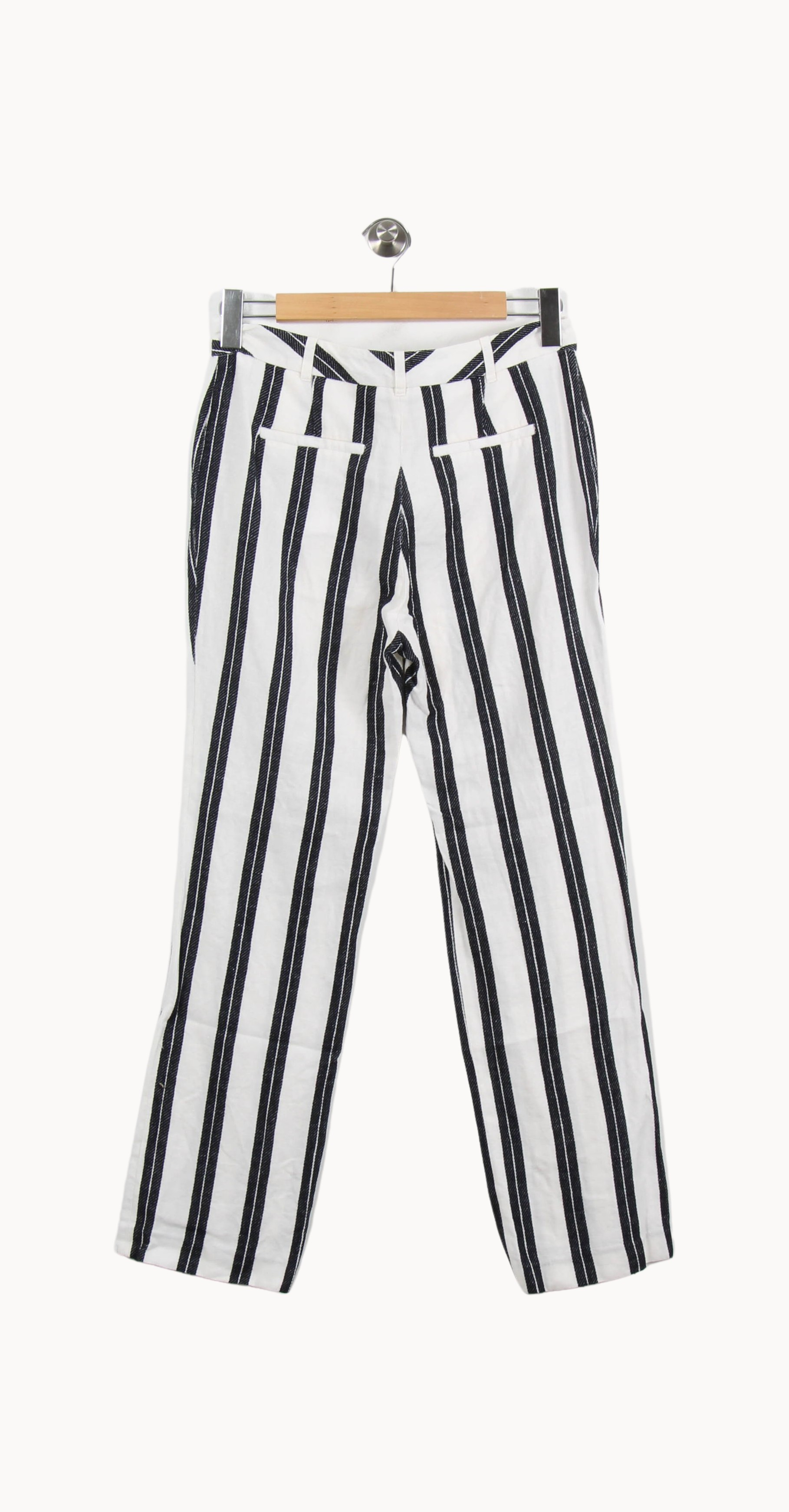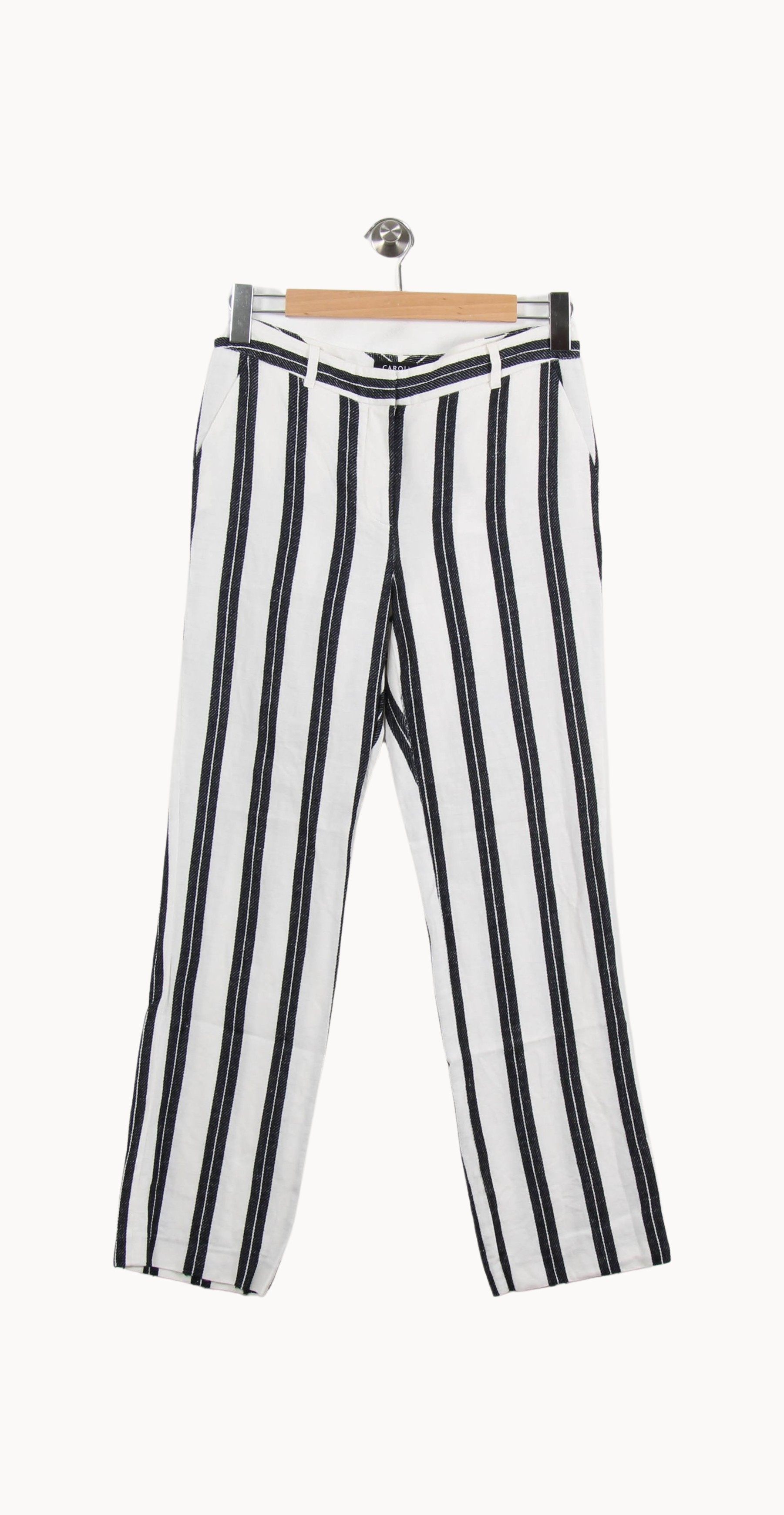 Pantalon à rayures verticales Caroll, taille M/38, blanc avec bandes noires, élégant et intemporel. Confectionné dans une matière légère et structurée, ce pantalon se distingue par ses rayures contrastantes qui allongent la silhouette et ses finitions soignées telles que les passants pour ceinture et les poches latérales. Parfait pour un déjeuner professionnel en été ou une sortie chic en ville.
