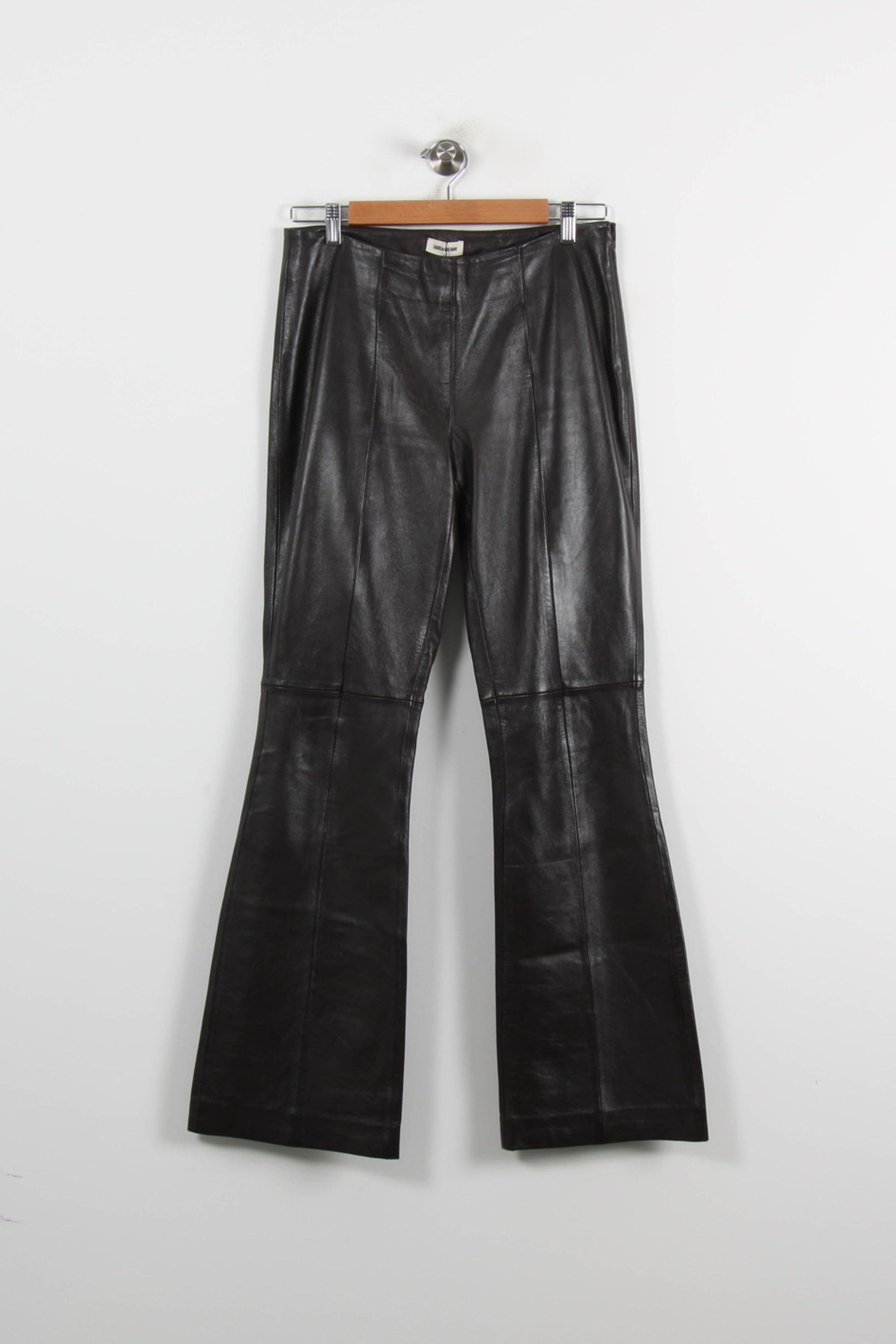 Pantalon flare en cuir Zadig&Voltaire, taille M/38, couleur marron. Modèle en cuir véritable au toucher lisse, doté de coutures apparentes sur la longueur des jambes et d’une coupe évasée, affirmant un style affirmé et sophistiqué. Idéal pour une soirée élégante ou pour apporter une touche rock à une tenue de bureau.