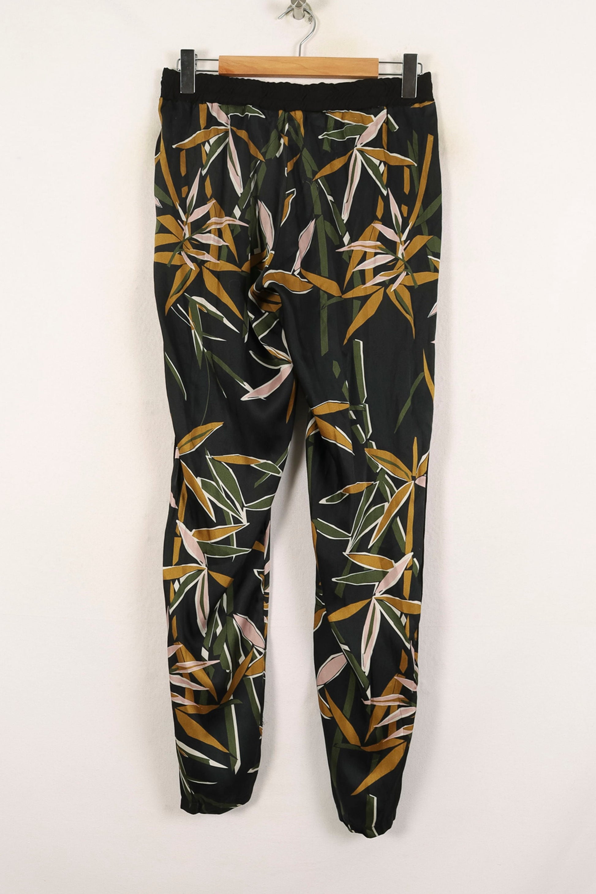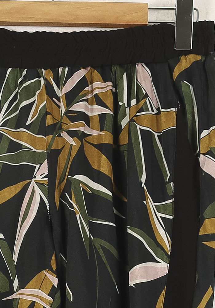 Pantalon fluide à imprimé feuillage La Fée Maraboutée, taille XL/42, coloris noir. Le tissu léger présente un motif végétal aux accents vert, ocre et rose pâle, apportant une touche d’originalité élégante au vêtement, tandis que la taille élastiquée assure confort et aisance au porter. Parfait pour une journée estivale ou une sortie décontractée, il se porte facilement avec un haut uni et des sandales.