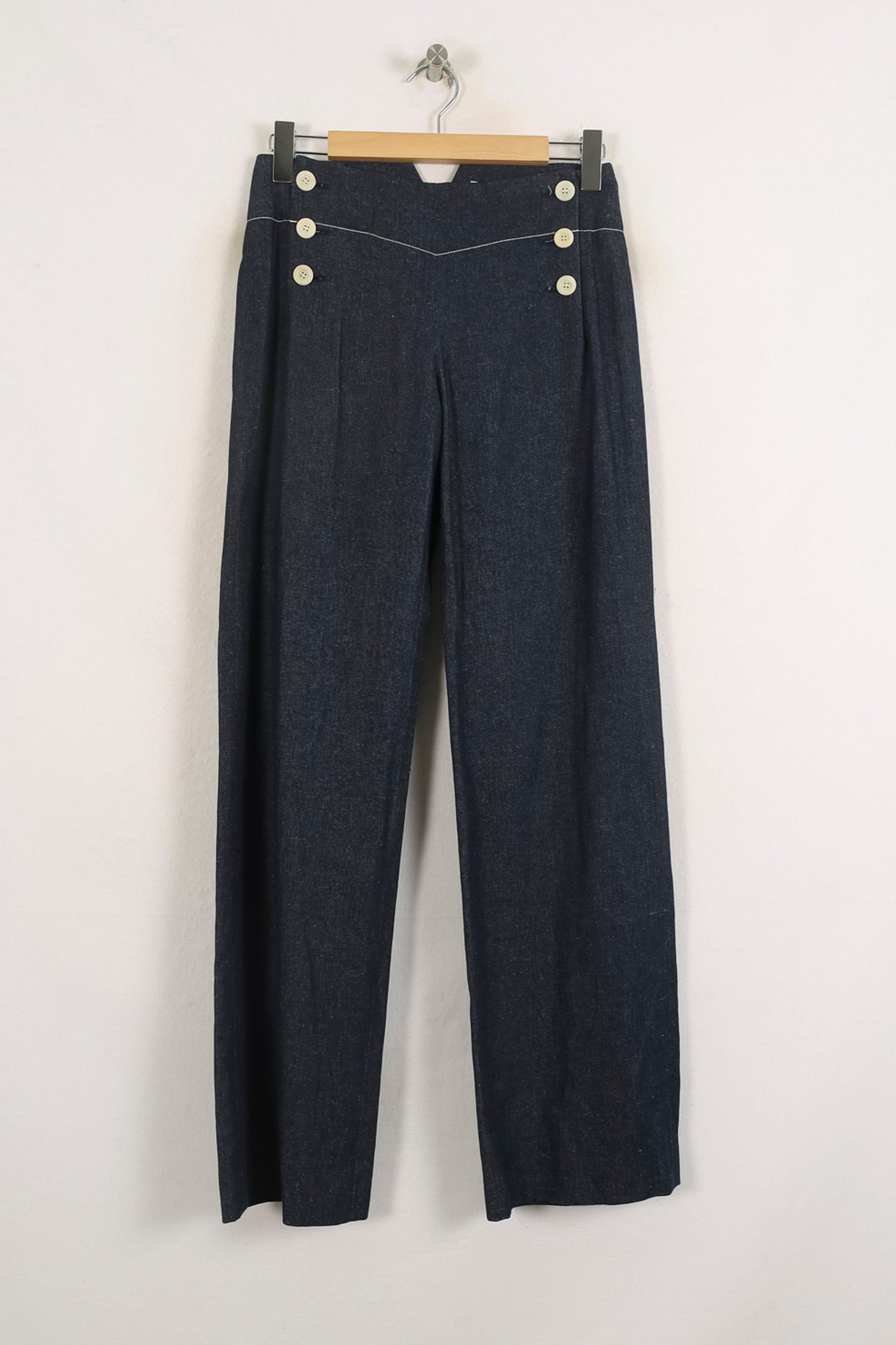 Pantalon taille haute bleu, coupe large, de la marque Ines de la Fressange Paris, taille S/36. Confectionné dans une matière à l’aspect denim bleu profond, ce pantalon se distingue par sa taille structurée ornée de six boutons contrastants sur le devant, apportant une touche élégante et originale. Idéal pour une journée de travail ou pour un rendez-vous en ville grâce à son style raffiné et intemporel.
