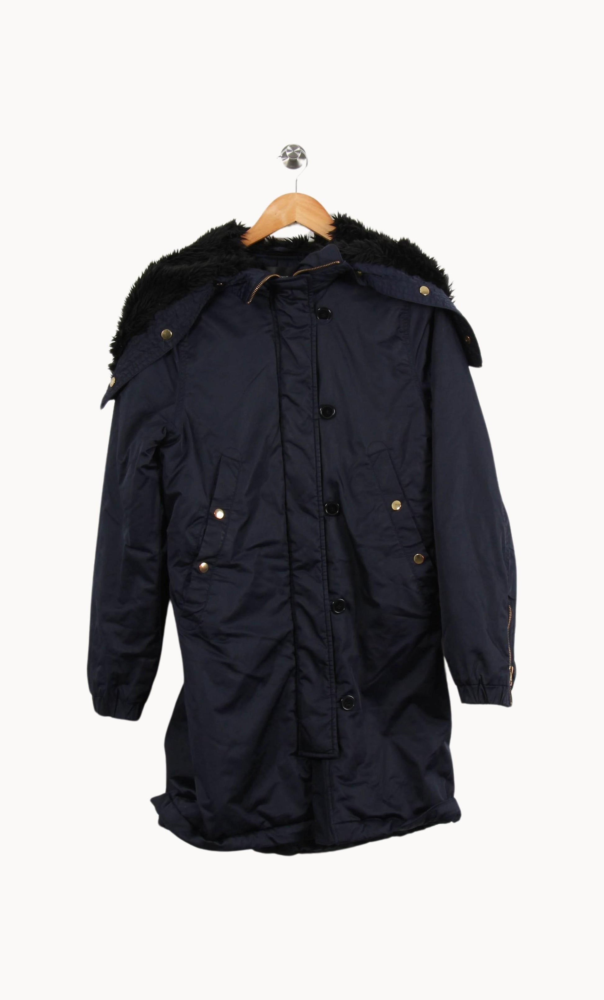 Manteau bleu Filippa K, taille S/36, à capuche bordée de fausse fourrure, doté d’une fermeture pressionnée et zippée ainsi que de poches à rabat. La matière technique, à l’aspect légèrement mat, est rehaussée d’élégants boutons noirs et de détails dorés sur les poches, conférant à ce manteau une touche sophistiquée et fonctionnelle. Idéal pour affronter les journées froides en ville ou lors de promenades hivernales.