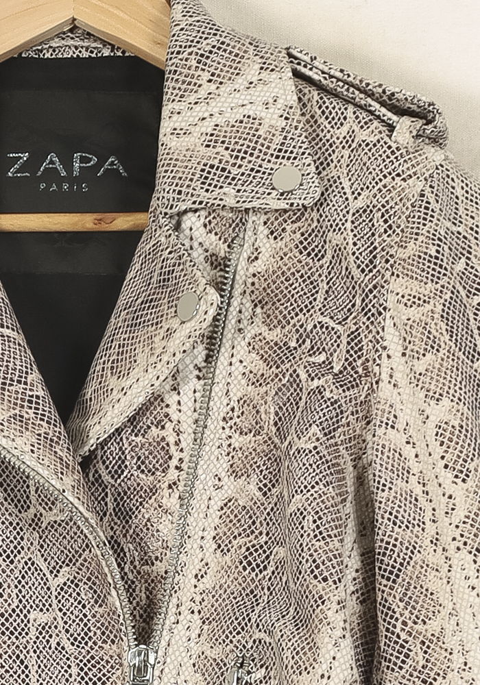 Veste multicolore ZAPA taille M/38, à motif python, dotée d’une coupe moderne et élégante. Confectionnée dans une matière effet cuir avec imprimé reptile, elle se distingue par ses finitions argentées, ses épaulettes marquées et ses zips apparents qui lui apportent du caractère et de l’originalité. Parfaite pour sublimer une tenue décontractée lors d’une sortie en ville ou pour apporter une touche audacieuse à un look de soirée.