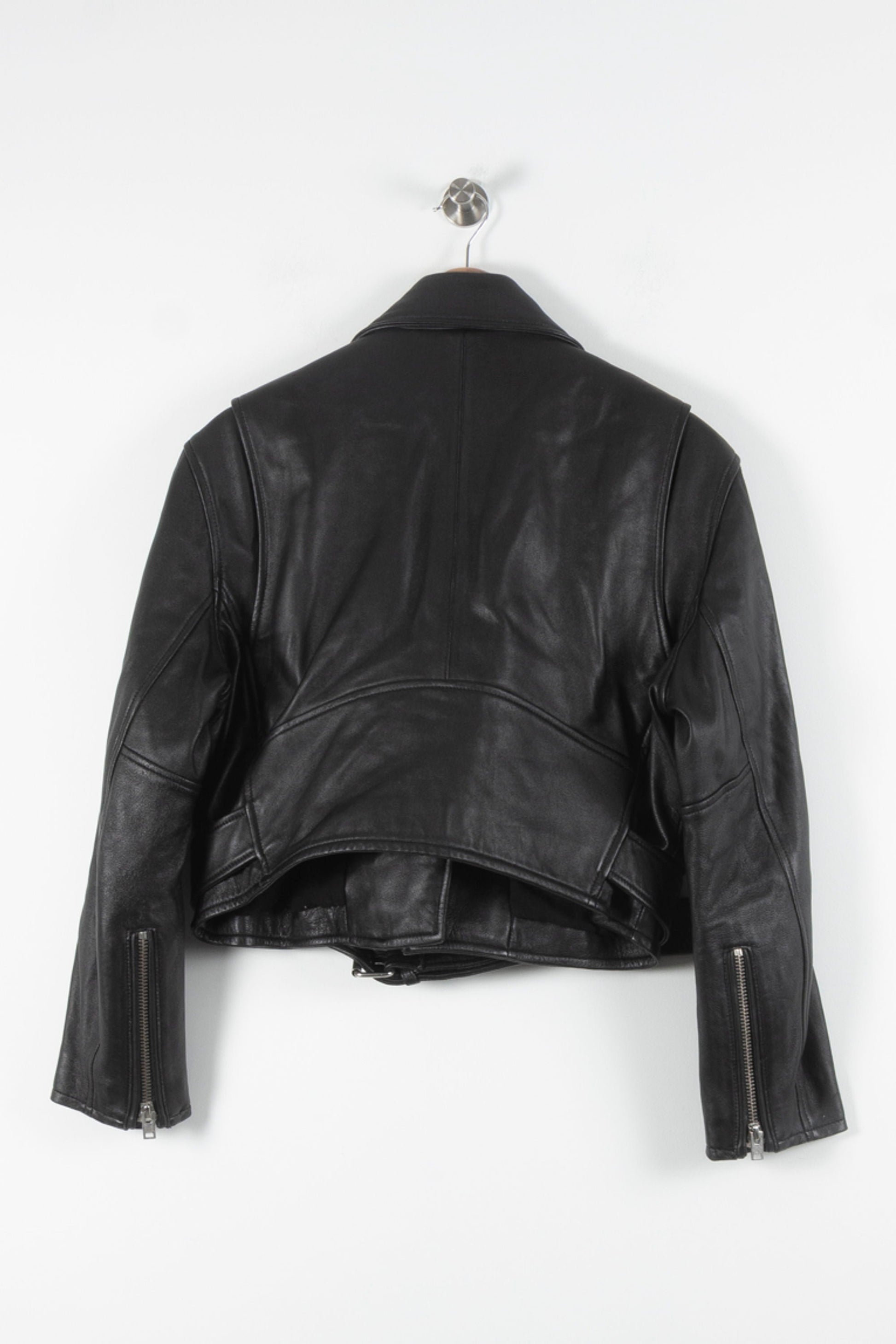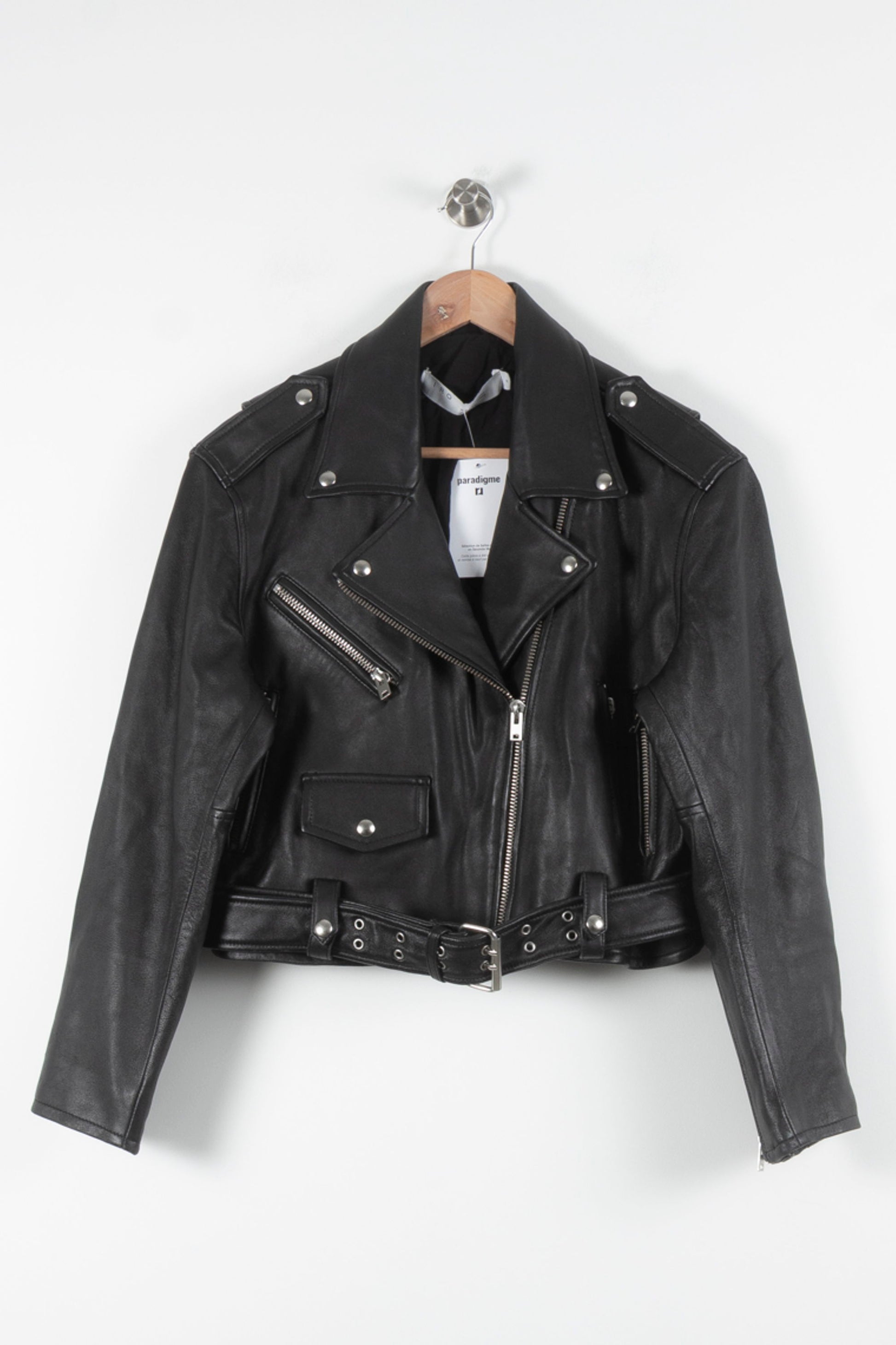 Veste biker noire en cuir d'agneau IRO, taille M/38, idéale pour une allure élégante et affirmée. Confectionnée en cuir d’agneau, cette veste présente une silhouette structurée, agrémentée de détails zippés argentés, d’épaulettes et d’une ceinture à œillets, lui conférant un style authentique et raffiné. Parfaite pour une soirée en ville ou pour rehausser une tenue casual chic au quotidien.