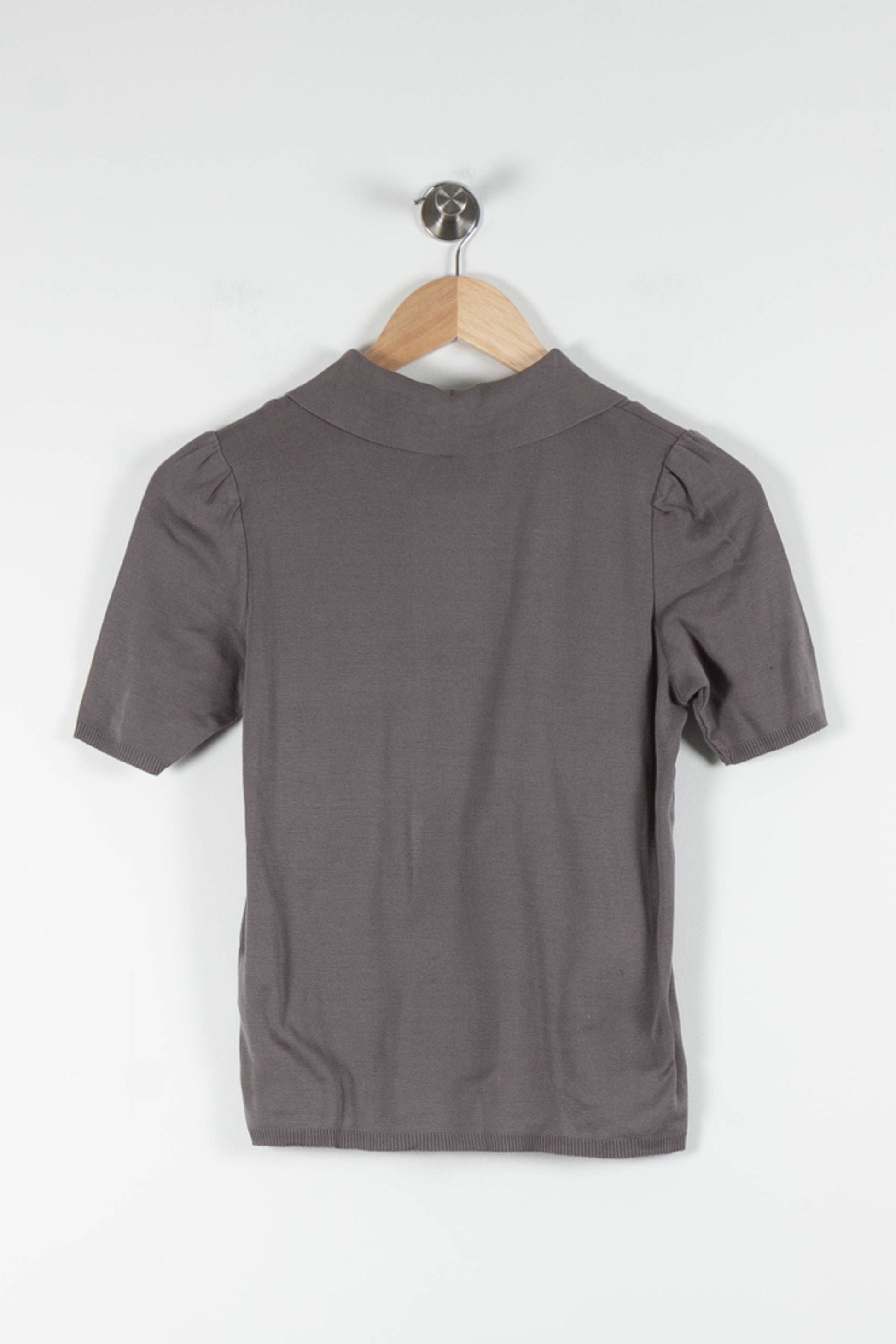 Top gris à manches courtes IKKS, taille S/36 – Un basique raffiné signé IKKS, parfait pour une allure élégante et moderne. Confectionné dans une maille douce et fine, ce top se distingue par ses détails soignés tels que le col chemise et les deux fausses poches poitrine ornementées, apportant une touche de caractère à ce vêtement intemporel. Idéal pour une journée au bureau, il s’associe facilement à un pantalon tailleur ou une jupe droite pour un look professionnel et élégant.