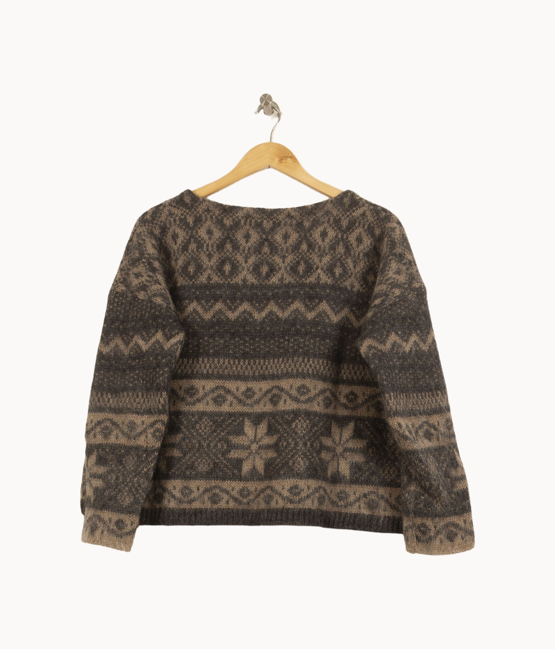 Confectionné dans une maille douce, ce pull présente de subtils motifs géométriques et floraux qui lui confèrent une identité chaleureuse et authentique.