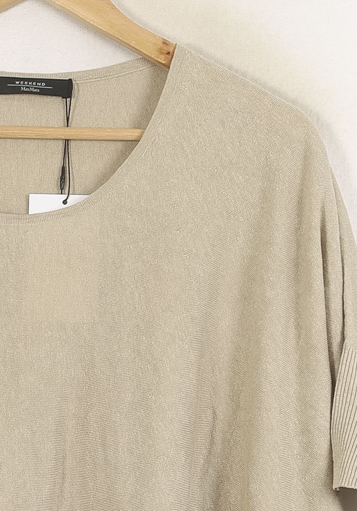 Pull beige Max Mara taille M/38, à la coupe ample et manches courtes, parfait pour un style épuré et contemporain. Confectionné dans une matière douce, il présente des détails côtelés au niveau des manches, apportant une touche subtile et raffinée à ce modèle intemporel. Idéal pour une journée au bureau ou un brunch décontracté, il se porte facilement avec un pantalon ou une jupe.