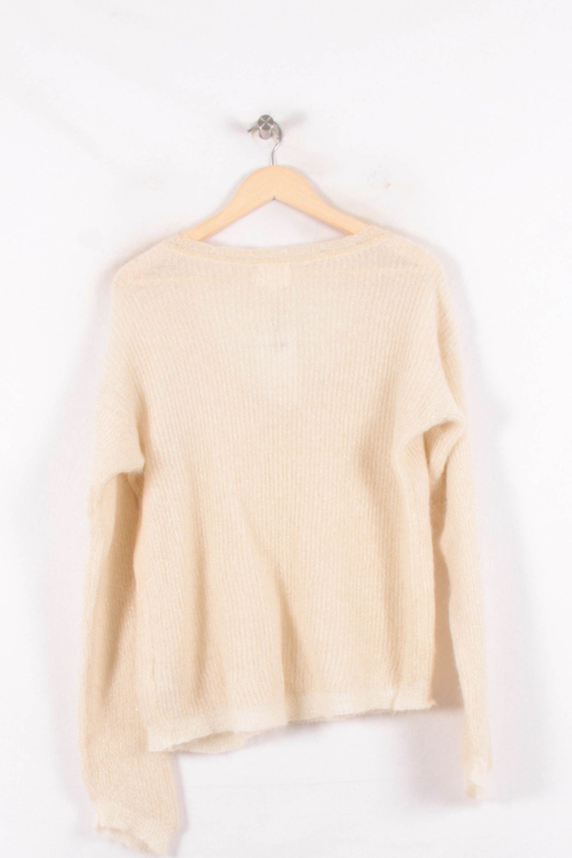 Pull col V beige Maison 123, taille M/38, confectionné dans une maille douce et légère à la texture subtilement duveteuse. Sa matière délicate présente un effet légèrement chiné et apporte une touche d’élégance discrète, tandis que la coupe ajustée aux finitions soignées souligne la silhouette avec raffinement. Parfait pour une journée au bureau ou un déjeuner en ville, ce pull s'adapte à toutes les occasions avec style.