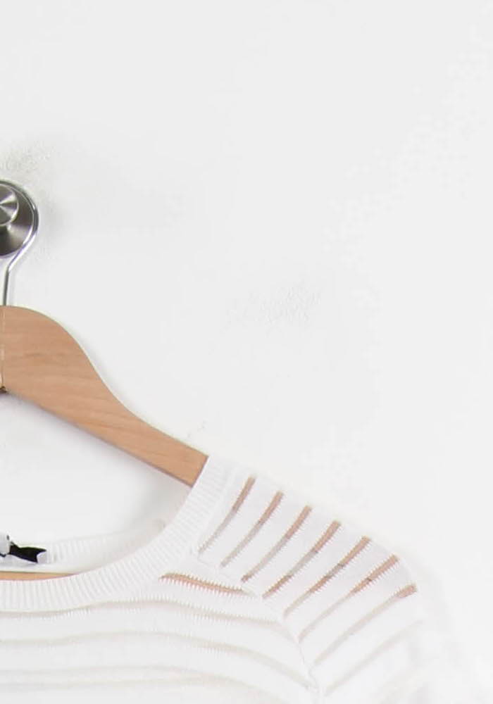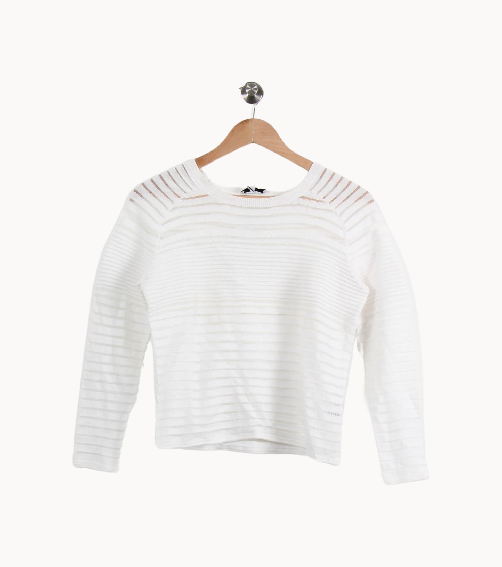 Pull blanc Suncoo taille S/36, au design élégant et moderne, idéal pour compléter votre vestiaire de saison. Sa maille ajourée présente des jeux de transparence en fines bandes horizontales, apportant une touche graphique et raffinée qui met subtilement en valeur la silhouette. Ce pull se porte à merveille lors d’un brunch chic ou d’une sortie en ville, associé à un pantalon habillé ou une jupe.