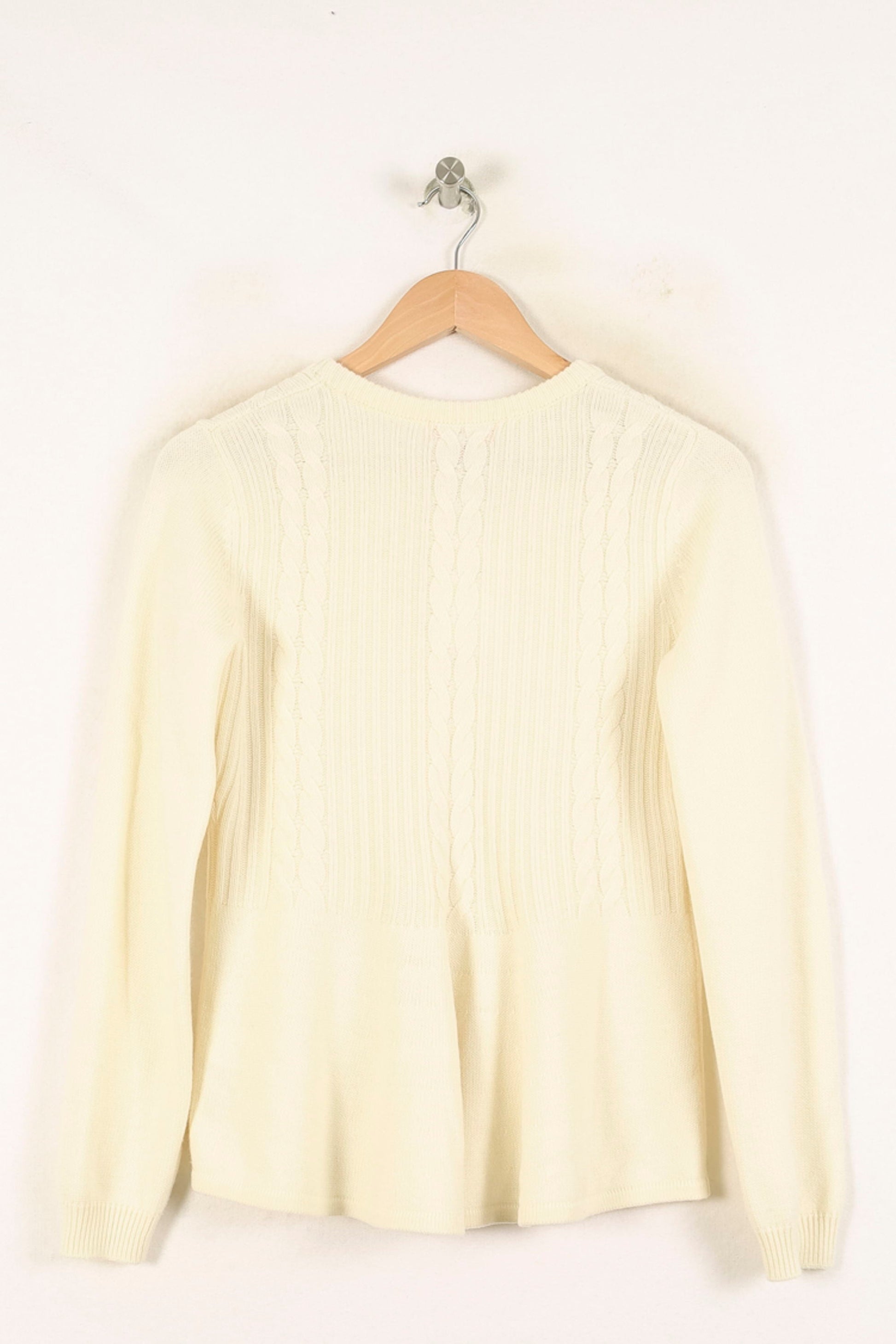 Pull blanc Derhy taille S/36, à manches longues, col rond et maille élégante. Sa maille douce arbore des motifs torsadés sur le devant et une coupe légèrement évasée à la base, lui conférant une touche de raffinement discrète et féminine. Parfait pour une journée au bureau ou un déjeuner en ville, il allie confort et élégance avec simplicité.
