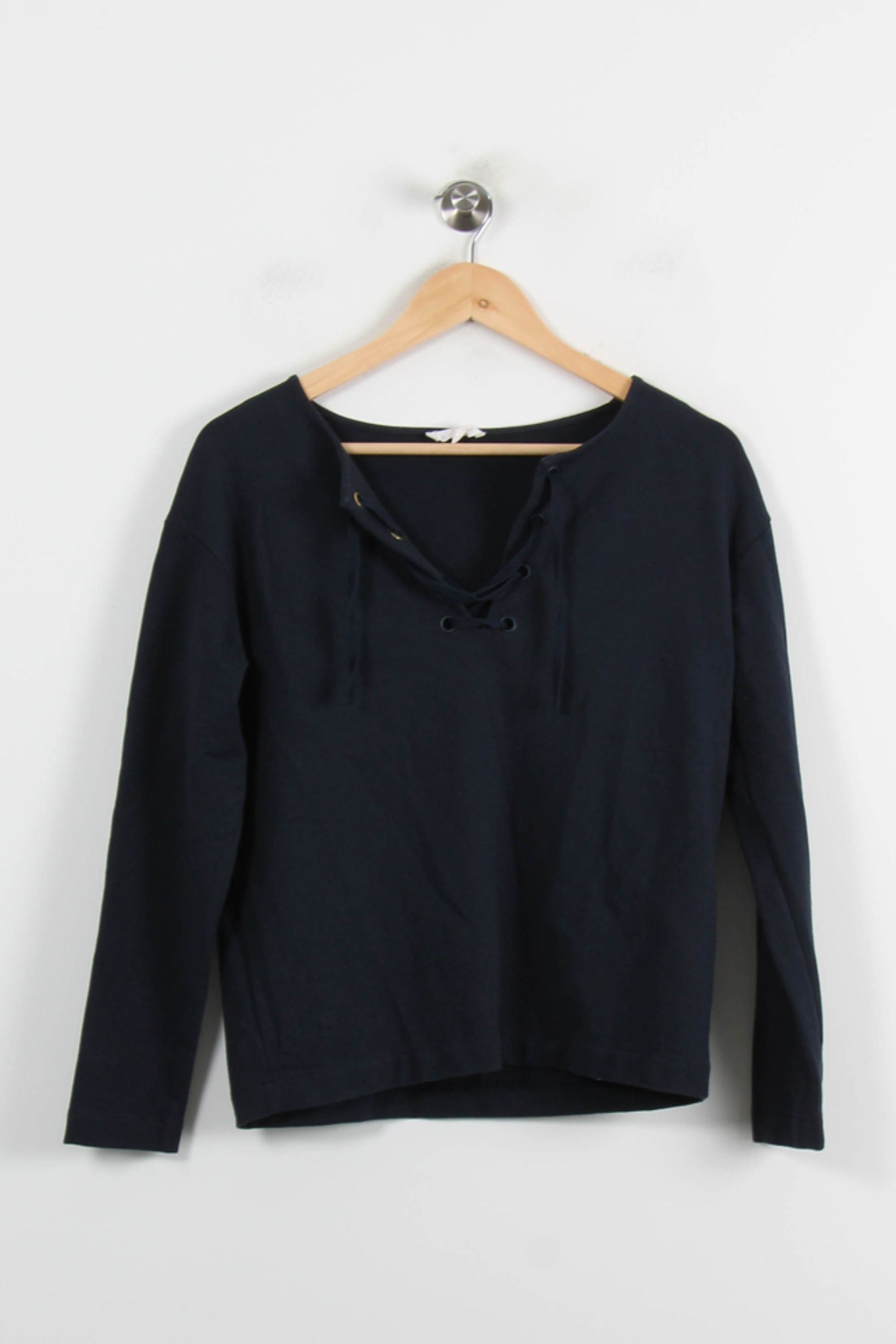 Pull bleu Maison 123, taille M/38, élégant et intemporel, parfait pour la saison. Confectionné dans une maille douce, ce pull se distingue par son col à laçage avec œillets métalliques, un détail raffiné qui lui confère un style unique tout en restant sobre. Idéal pour une journée de travail ou un déjeuner en ville, il s'accorde facilement à toutes vos tenues.