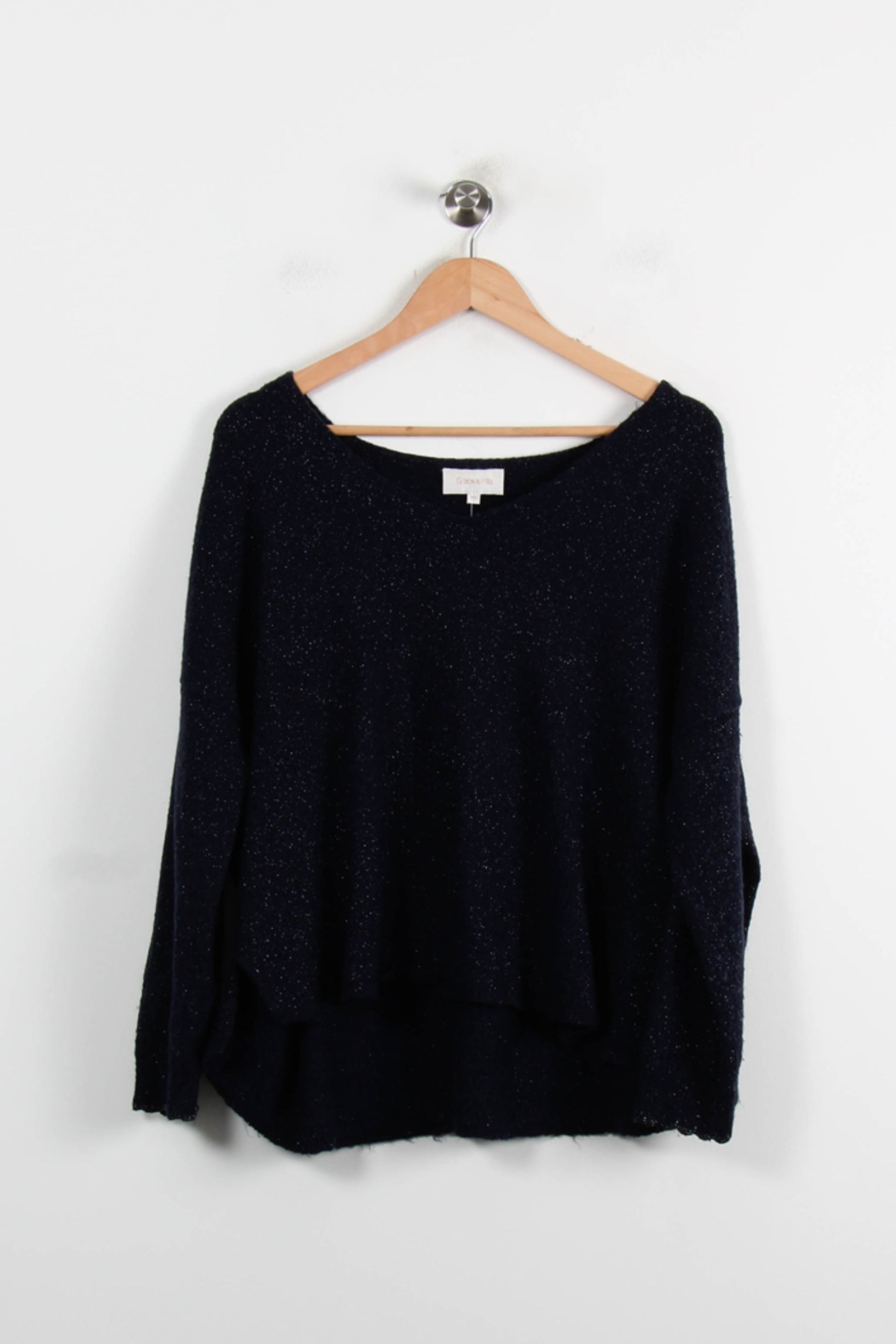 Pull bleu Grace & Mila en taille M/38, un modèle élégant à la coupe ample et à l’encolure dégagée. Confectionné dans une maille fine avec un léger effet scintillant, ce pull se distingue par sa simplicité sophistiquée et son tomber fluide. Idéal pour une journée de travail ou une sortie entre amis, il apporte une touche de chic tout en restant confortable.
