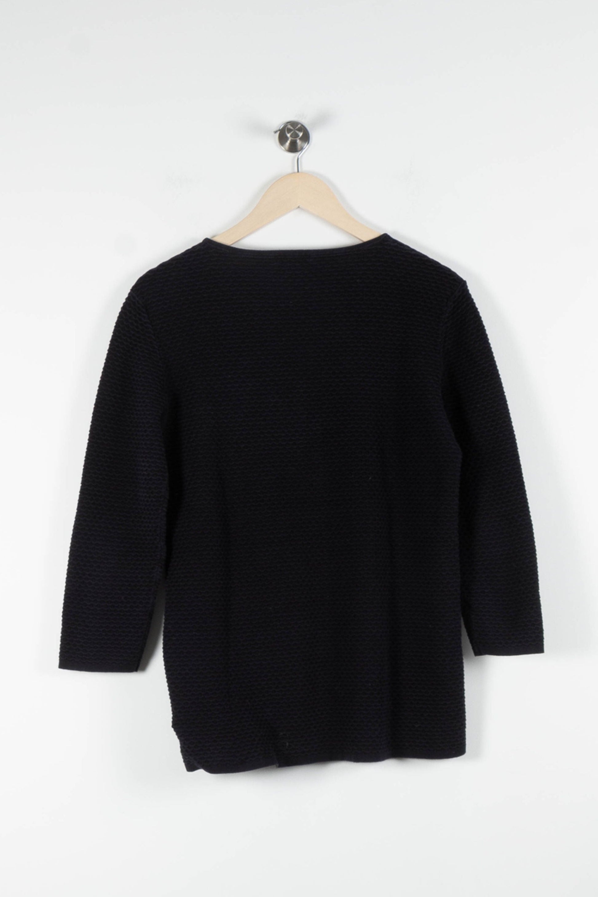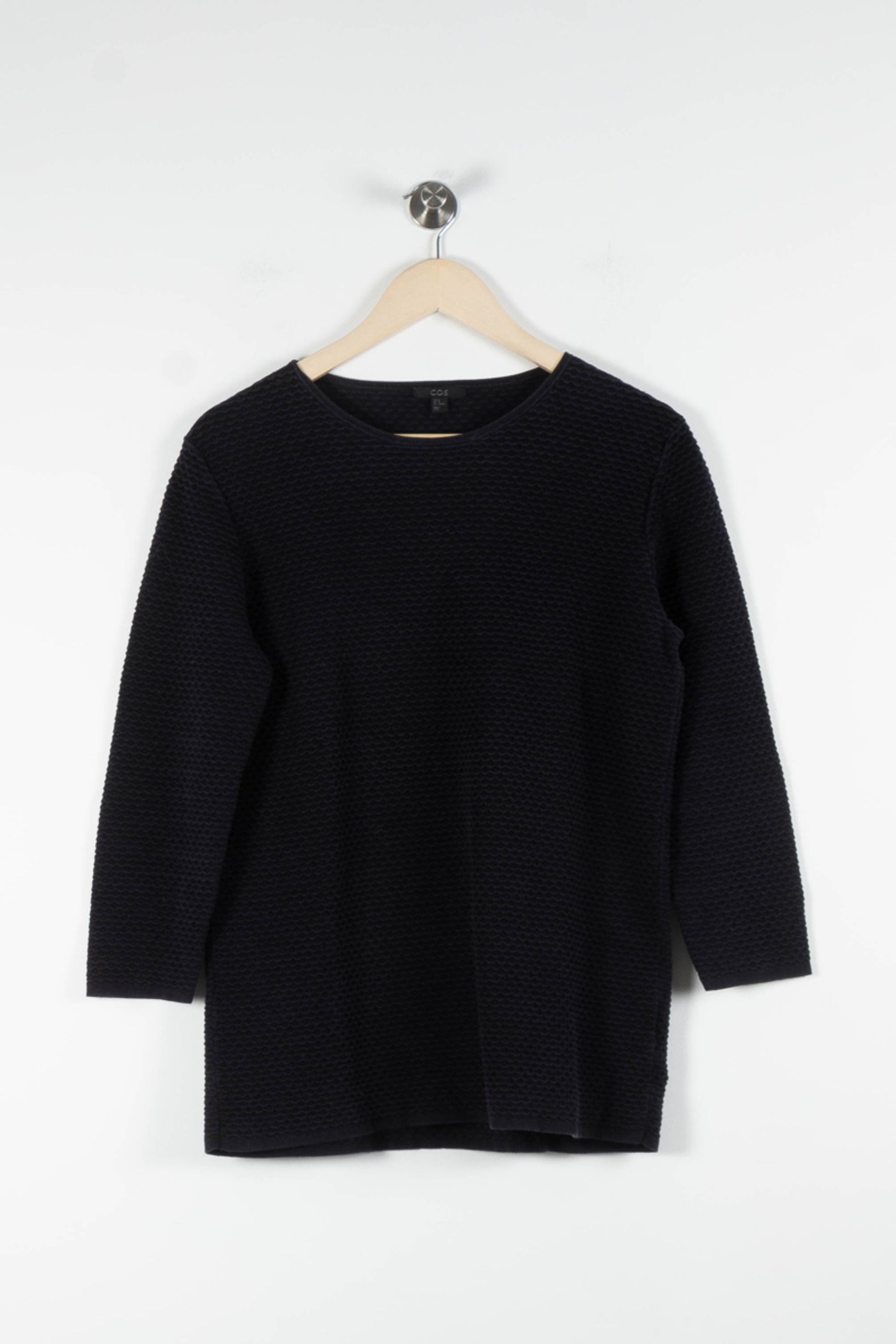 Pull bleu taille M/38 de la marque COS, à la coupe droite et manches longues, parfait pour une allure sobre et contemporaine. Confectionné dans une maille texturée apportant relief et caractère, il se distingue par un col rond épuré et des finitions soignées qui en font une pièce polyvalente. Idéal pour une journée de travail ou une sortie en ville, ce pull vous accompagnera avec élégance au quotidien.