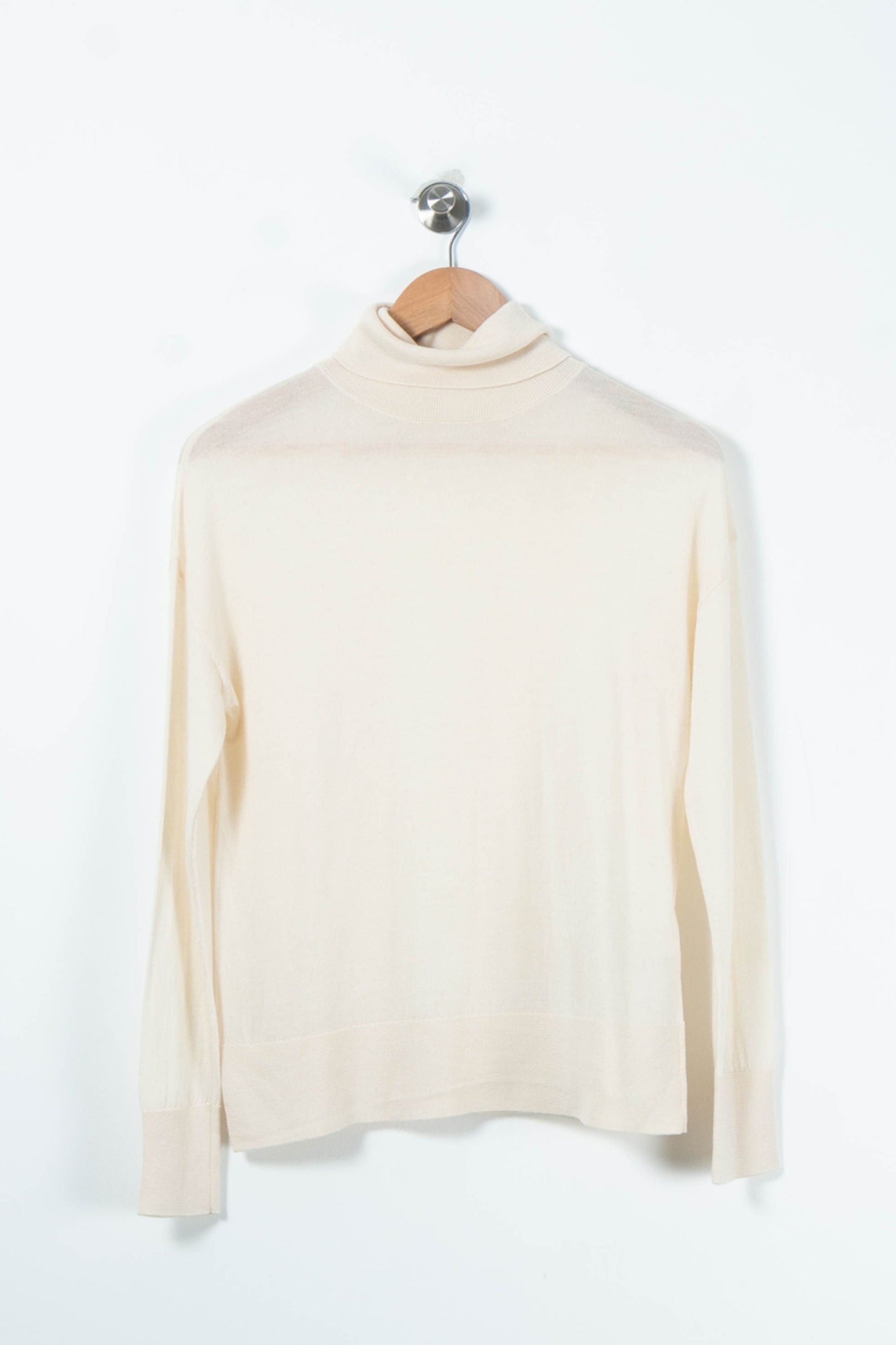 Pull col roulé beige Maison 123, taille M/38, au design épuré et intemporel. Confectionné en 100% laine, ce pull se distingue par sa douceur et sa finition délicate, avec des bords côtelés au col, aux poignets et à la taille, qui lui confèrent une allure élégante et raffinée. Idéal pour une journée de travail ou un dîner chic, il s’intègre parfaitement à une tenue sophistiquée et confortable.