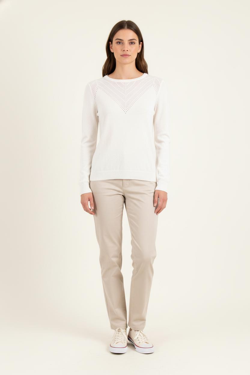 Pull blanc Grace & Mila en taille S/36, alliant élégance et simplicité dans un design raffiné, idéal pour la saison. Sa matière légère se distingue par un délicat motif ajouré sur le haut du buste et les épaules, apportant une touche unique et sophistiquée à ce basique incontournable. Ce pull se prête parfaitement à une journée de bureau ou à un brunch entre amis pour une allure chic et décontractée.