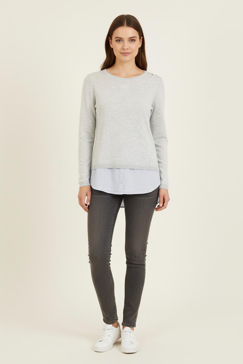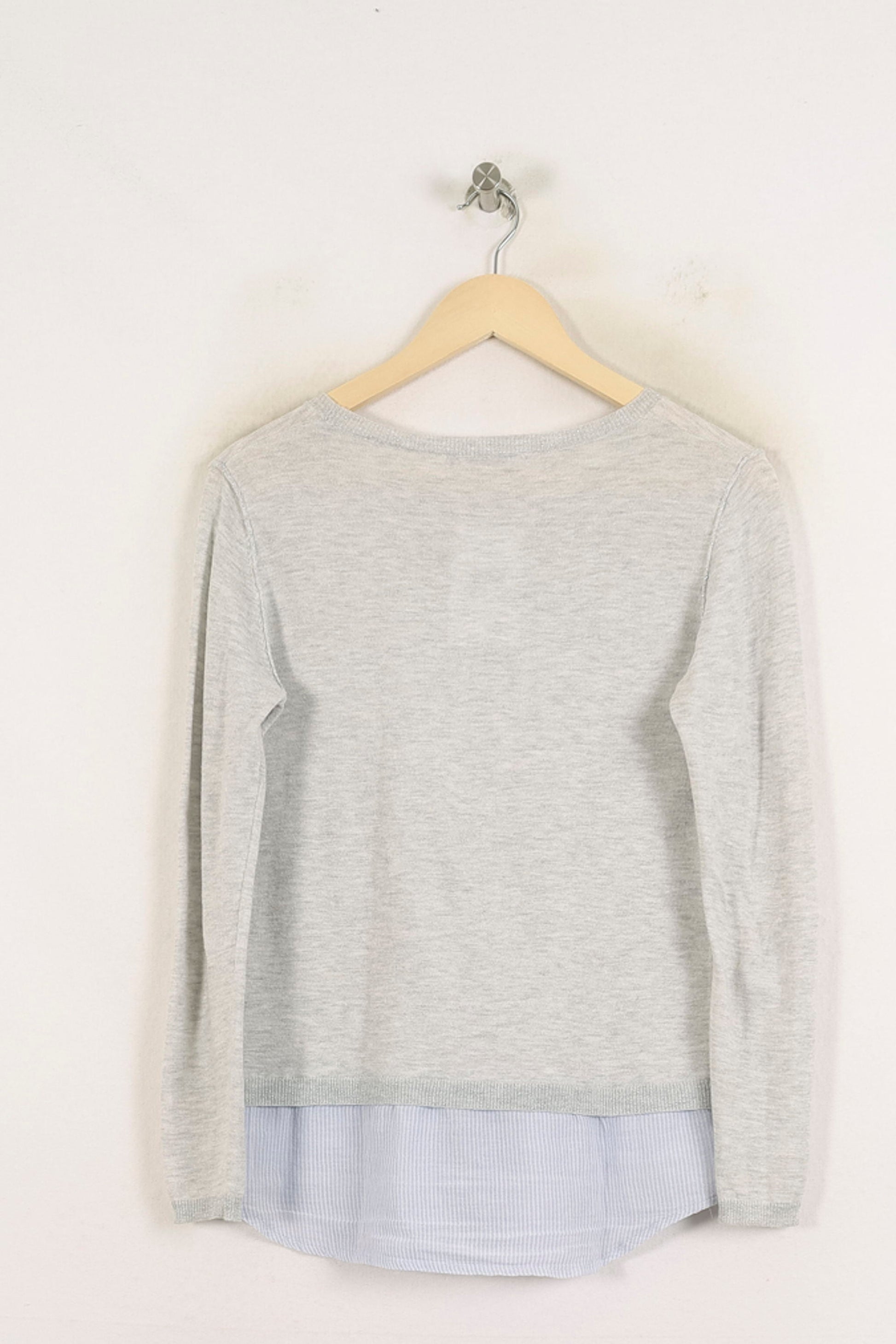 Pull Sud Express gris, taille S/36, subtilement rehaussé d’un effet superposé façon chemise à la base. La matière fine et douce offre un confort optimal, tandis que le détail des boutons sur l’épaule et l’ajout de tissu chemise rayé bleuté au bas rendent ce modèle unique et élégant. Parfait pour un look casual chic au bureau ou lors d’un déjeuner entre amis.