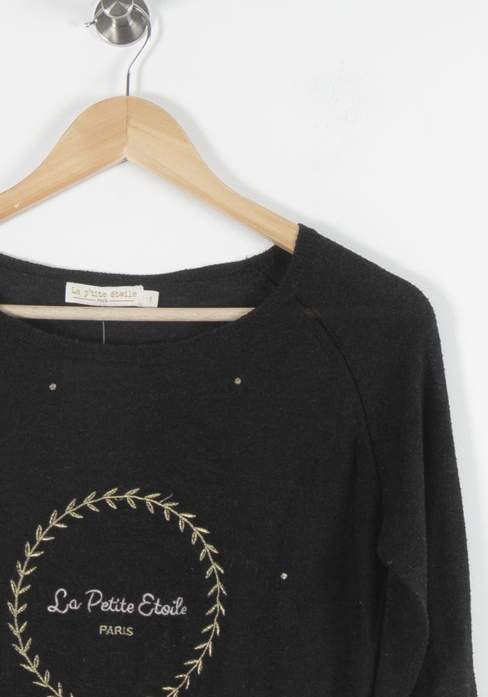 Pull gris La Petite Etoile, taille S/36, arborant une broderie centrale raffinée entourée d'une couronne dorée et parsemé de petits détails discrets. Confectionné en 55% polyester et 45% polyester, ce modèle se distingue par son motif brodé délicat et ses finitions soignées, lui conférant une touche d'élégance unique. Idéal pour une journée au bureau ou une sortie décontractée en ville, il apportera une note chic à toutes vos tenues.