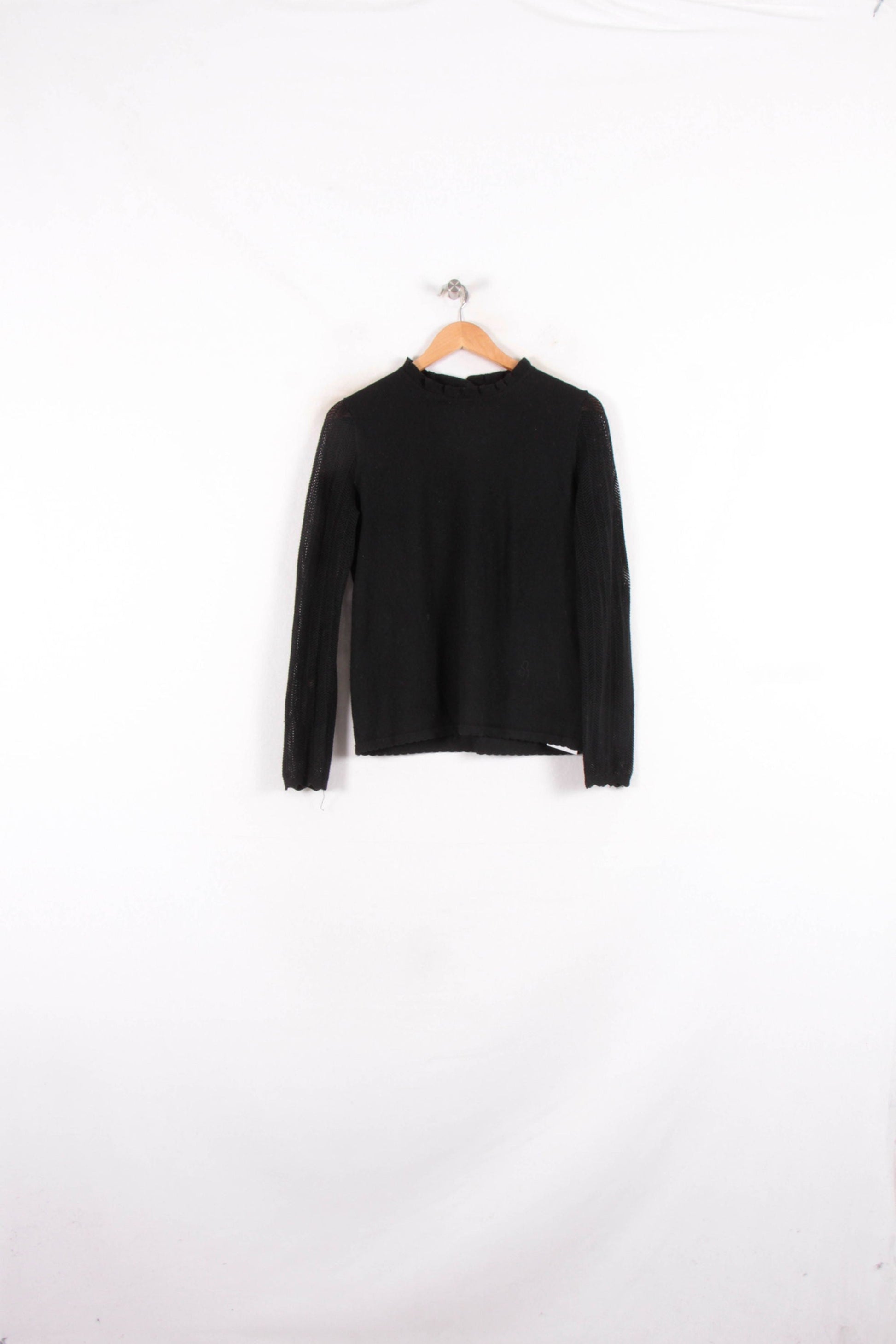 Pull noir Grace & Mila, taille M/38, élégant et intemporel, idéal pour compléter votre garde-robe de saison. Ce pull présente une maille fine avec un col légèrement volanté et des manches longues délicatement ajourées, apportant une touche de raffinement et d’originalité à la silhouette. Parfait pour une journée au bureau ou un dîner raffiné, il s'adapte aussi bien à un style casual chic qu'à une tenue plus habillée.