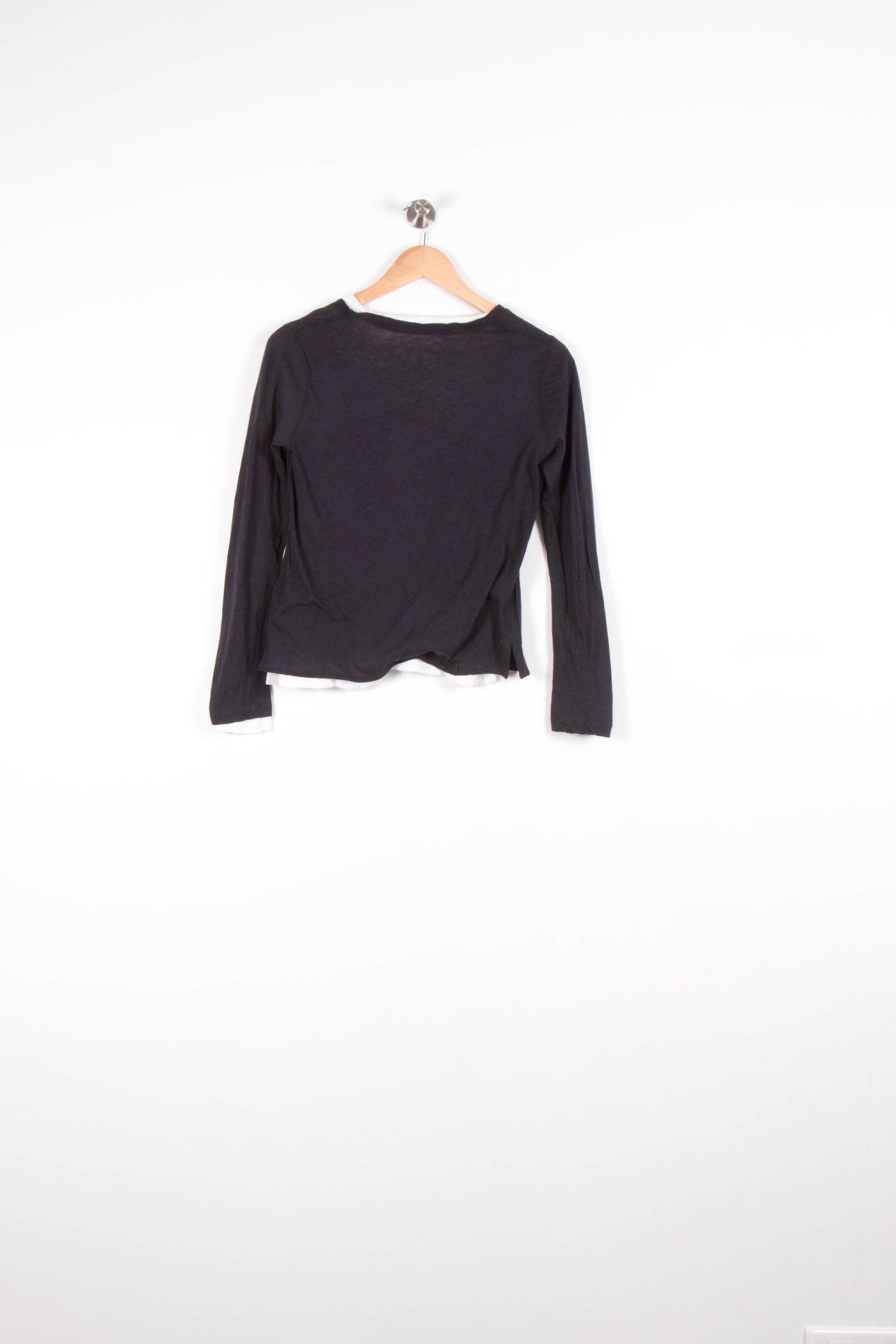 Top noir Majestic Filatures, taille S/36, doté de manches longues et d’un élégant col en V profond. La matière légère et souple assure un grand confort, tandis que la superposition intégrée avec un débordement blanc à la base et au col apporte une touche d’originalité à ce modèle classique. Idéal pour un look casual chic lors d’un déjeuner en ville ou pour une journée de travail décontractée.