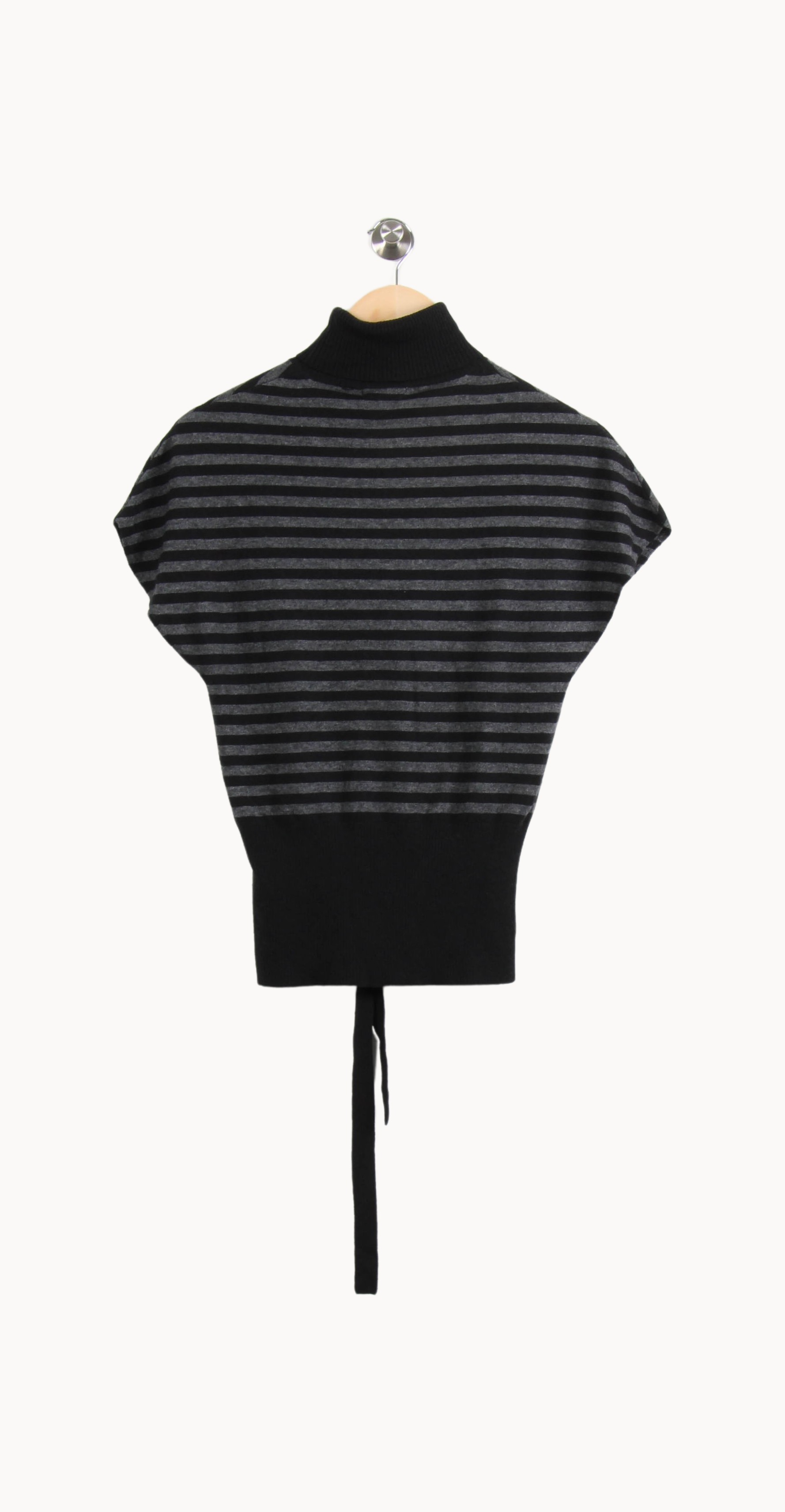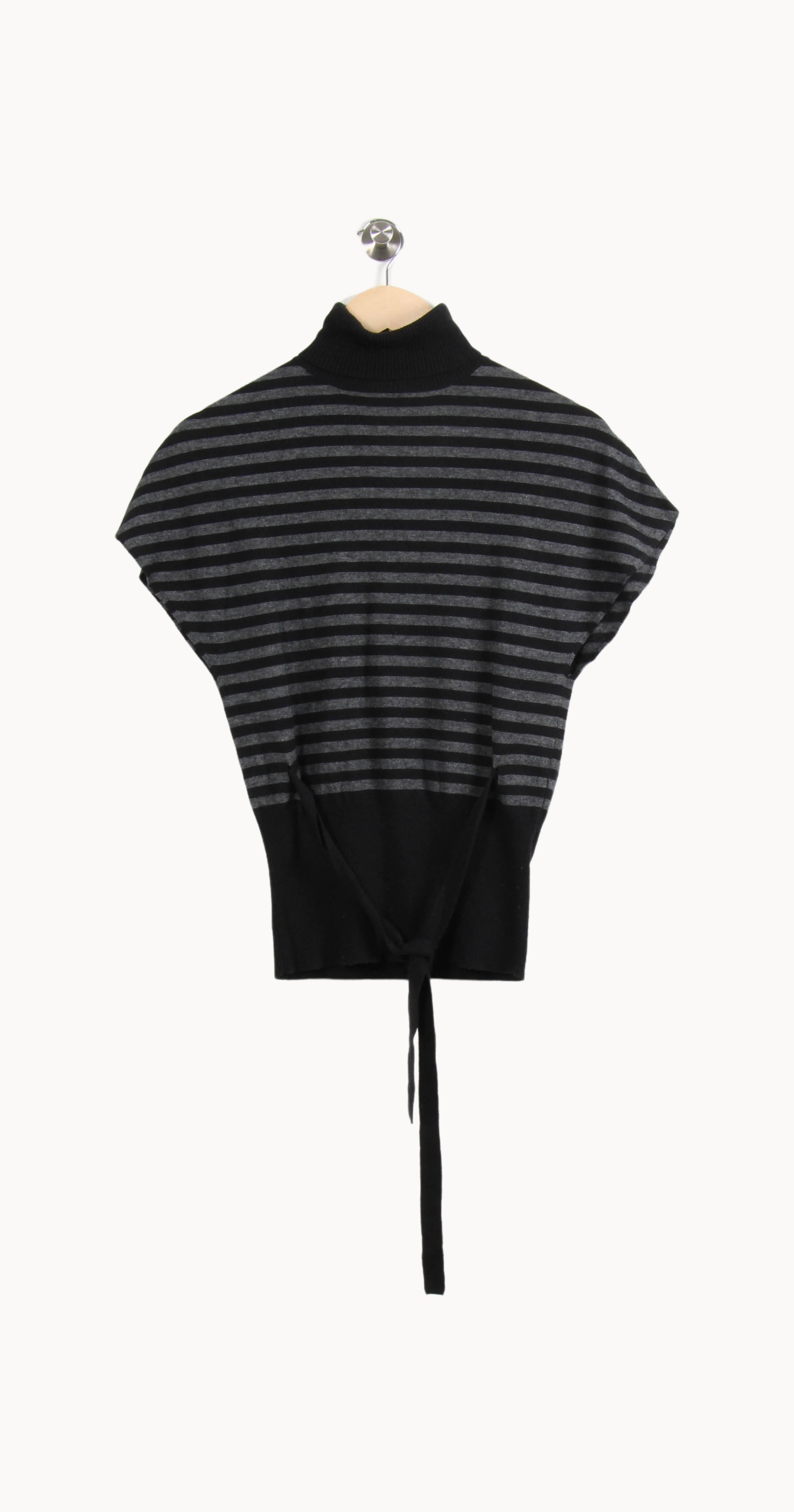 Top à rayures noir Maison 123, taille S/36, élégant et moderne avec son col montant et sa ceinture à nouer à la taille. Conçu dans une maille fine à rayures horizontales, ce modèle se distingue par ses manches chauve-souris et son tombé structuré, apportant une touche de sophistication et de singularité à la silhouette. Idéal pour une journée de travail ou un déjeuner en ville, il s’associe facilement avec un pantalon élégant ou une jupe taille haute.
