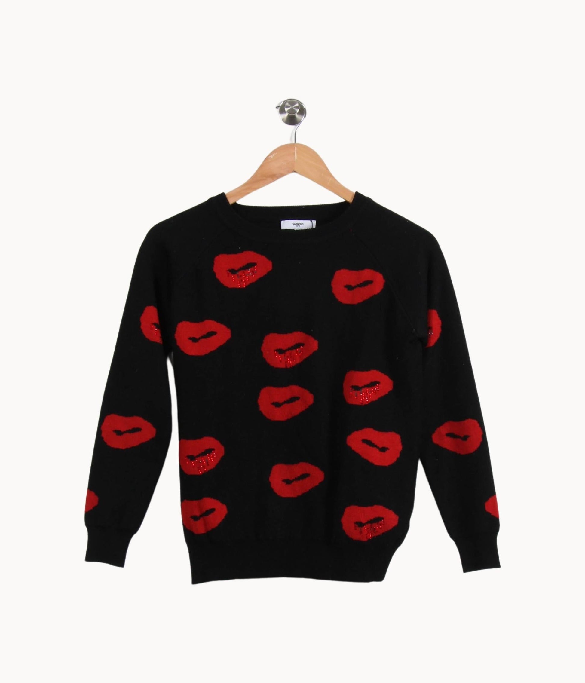 Pull Suncoo multicolore à motif lèvres rouges, taille S/36, offrant une allure audacieuse et tendance. Confectionné dans une maille confortable, ce pull se distingue par ses motifs lèvres rouges brodés qui apportent une touche graphique et originale à la pièce. Idéal pour dynamiser une tenue de journée ou pour une sortie décontractée entre amis.
