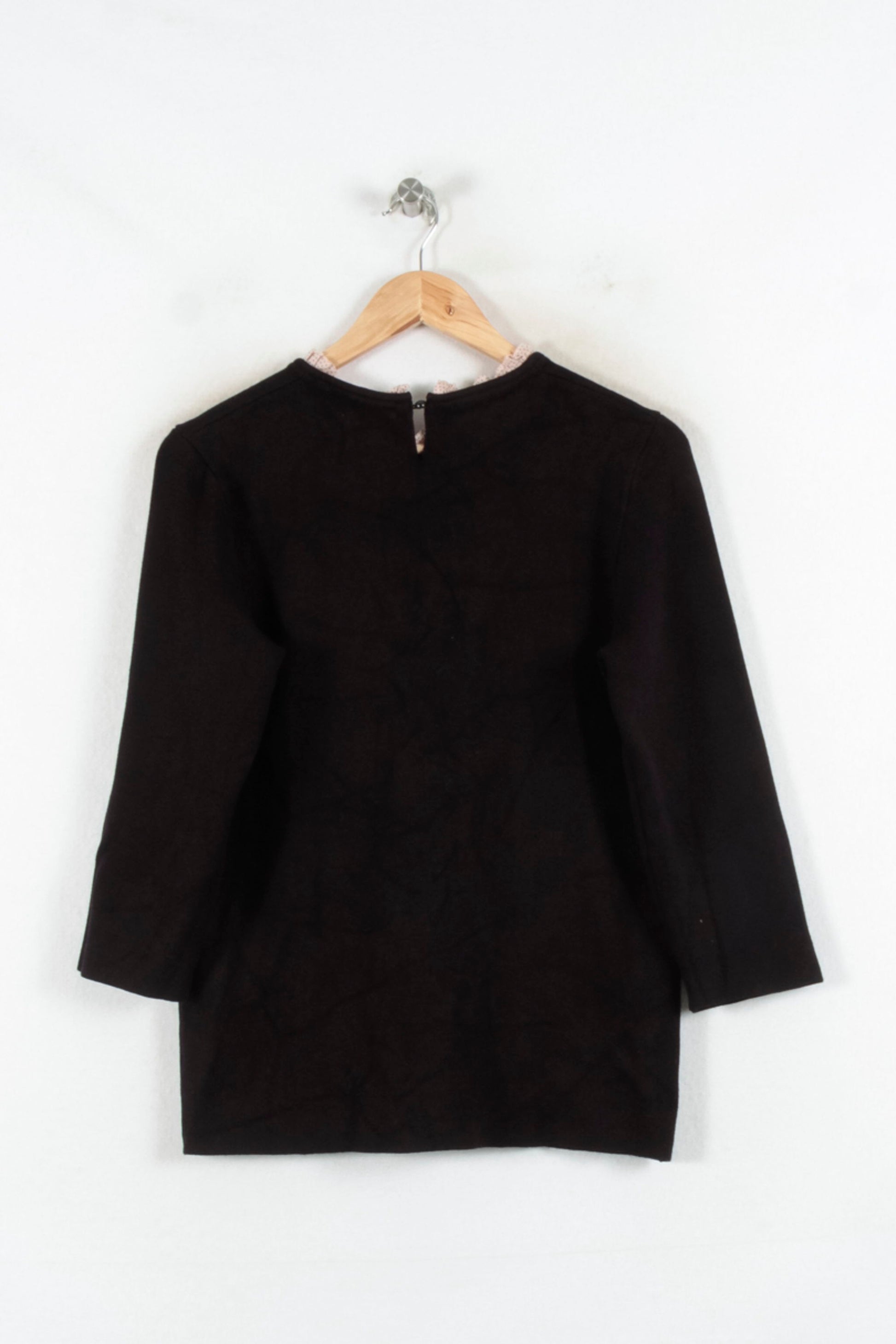 Pull noir Maison 123, taille L/40, élégant et intemporel, conçu dans une coupe classique à manches longues. La matière douce et le détail raffiné du col orné d’un léger volant contrasté lui confèrent un charme unique et une allure sophistiquée. Idéal pour une journée de travail chic ou pour un dîner en toute élégance.