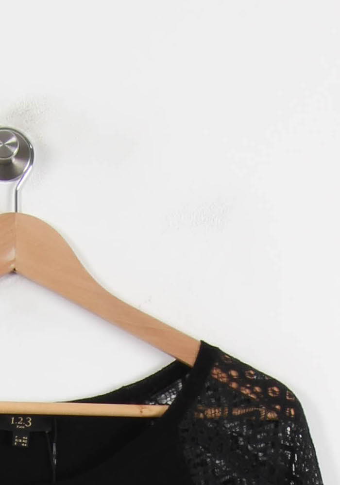 Pull noir Maison 123, taille M/38, élégant et féminin, parfait pour sublimer votre garde-robe. Ce modèle se distingue par ses manches trois-quarts en dentelle transparente, apportant une touche raffinée et délicate à la pièce, tandis que le corps du pull est confectionné dans une maille douce et confortable. Idéal pour une soirée élégante ou une journée de travail chic accompagné d’un pantalon habillé.