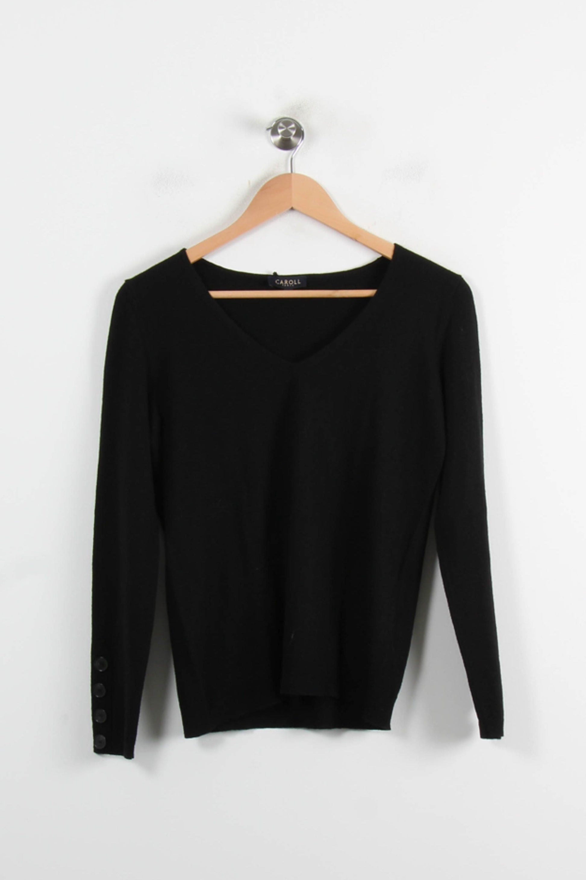 Pull noir en maille fine Caroll, taille M/38, modèle classique à col V. Confectionné dans une matière douce, ce pull se distingue par ses boutons décoratifs sur le bas des manches, apportant une touche d’élégance discrète. Parfait pour une réunion professionnelle ou une sortie en ville, il complète aisément une tenue chic et raffinée.