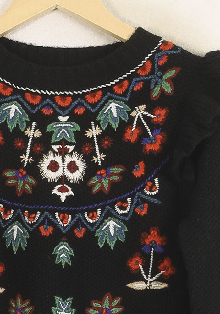Pull noir Derhy taille S/36, orné de broderies colorées florales et de détails volantés aux épaules. Ce modèle se distingue par sa matière tricotée douce, ses motifs brodés raffinés aux couleurs vives ainsi que les volants délicats qui lui apportent une touche féminine et singulière. Idéal pour une sortie citadine en journée, accompagné d’un pantalon ajusté ou d’une jupe élégante.