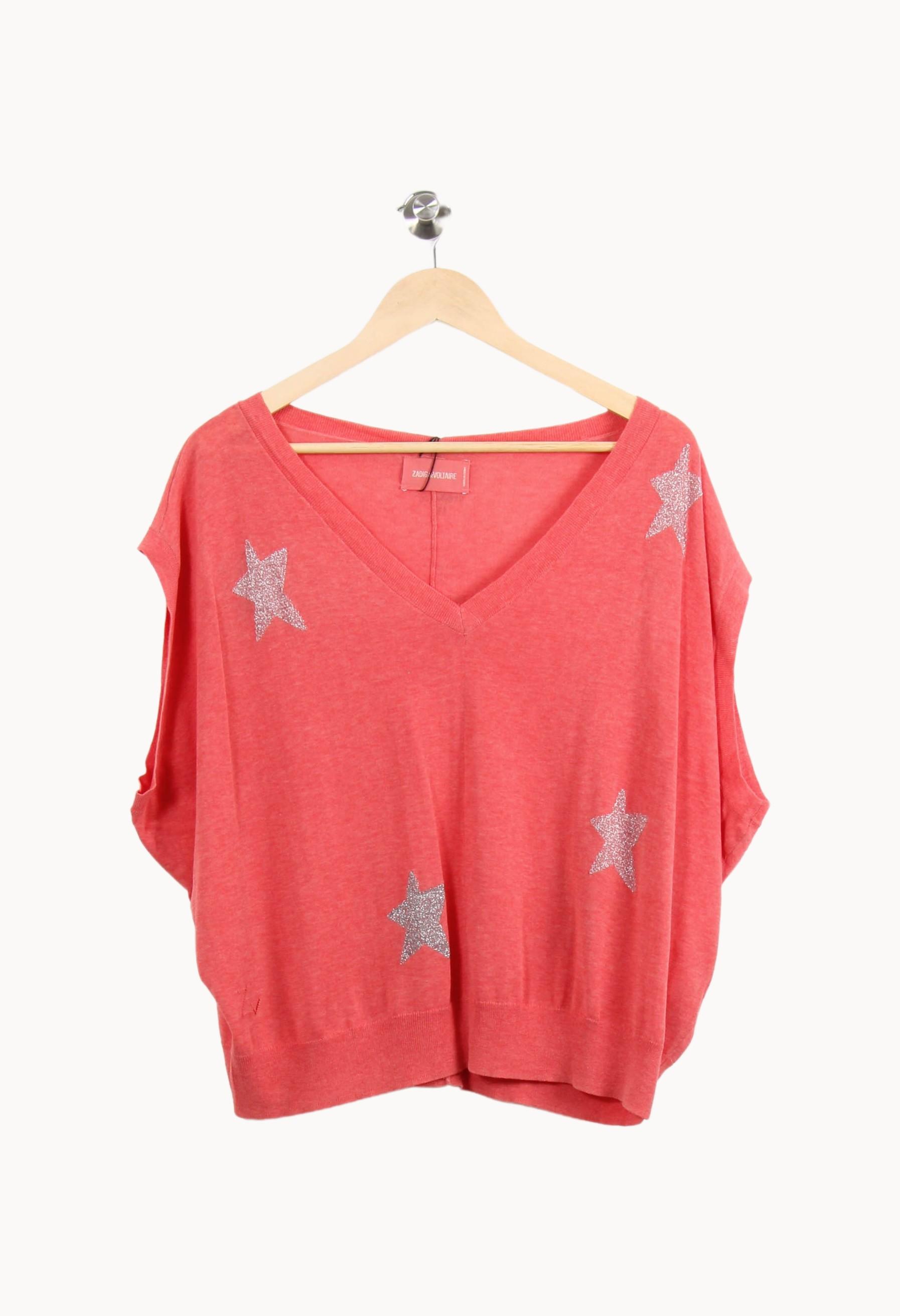 Pull ample Zadig&Voltaire rose, orné d’étoiles pailletées, taille XS/34, parfait pour une touche de fantaisie élégante. Confectionné dans une matière légère et douce, ce pull se distingue par son encolure en V flatteuse et ses détails argentés en forme d’étoiles qui apportent originalité et luminosité à la pièce. Idéal pour une sortie décontractée entre amis ou pour illuminer une tenue de journée.