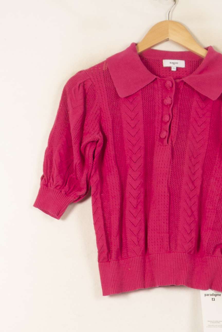 Pull col polo rose Suncoo, taille S/36, un modèle élégant et féminin issu de la collection de la marque Suncoo. Confectionné dans une maille texturée, ce pull se distingue par son tricot à motifs chevronnés, ses boutons recouverts assortis et ses manches mi-longues légèrement bouffantes, pour une allure raffinée et sophistiquée. Idéal pour une journée au bureau ou un déjeuner entre amies, il apporte une touche de couleur et de chic à toutes vos tenues.