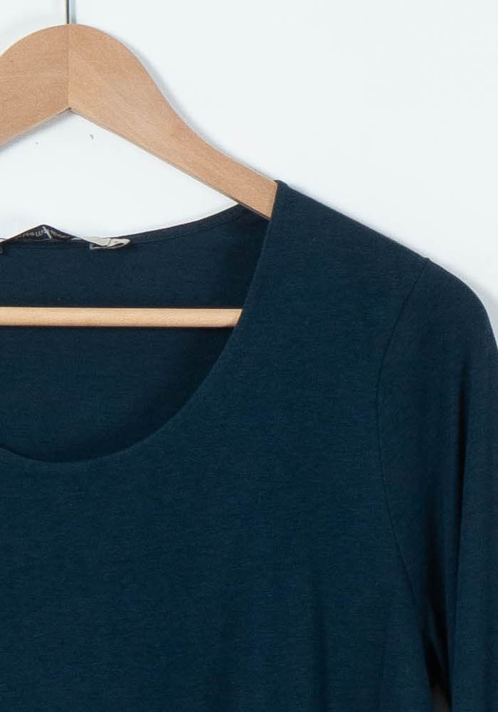 Pull à manches longues La Fée Maraboutée, taille M/38, de couleur vert foncé, au design épuré et col rond. Sa matière fluide et légère, associée à une coupe droite, confère à ce modèle un confort optimal, tandis que l'absence de détails superflus met en valeur son élégance intemporelle. Idéal pour une journée de travail ou une sortie décontractée, il s'associe facilement à tous les styles.