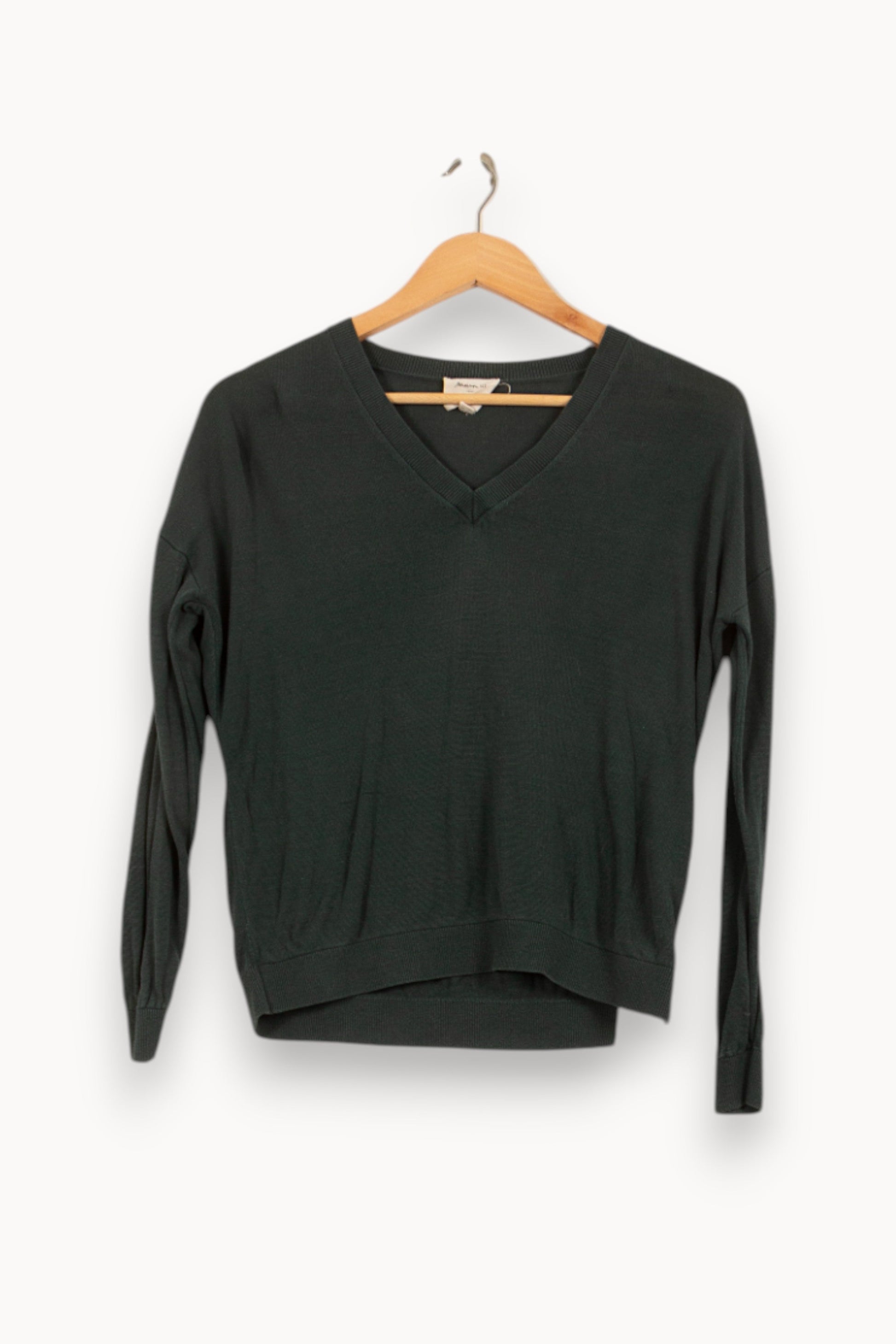 Pull col V vert Maison 123, taille S/36, élégant et intemporel, idéal pour sublimer une silhouette avec simplicité. Sa maille fine lui confère un tombé fluide, tandis que les finitions côtelées au bas des manches et à la taille apportent une touche de raffinement, caractéristique des créations Maison 123. Parfait pour une journée au bureau ou un dîner décontracté entre amis.