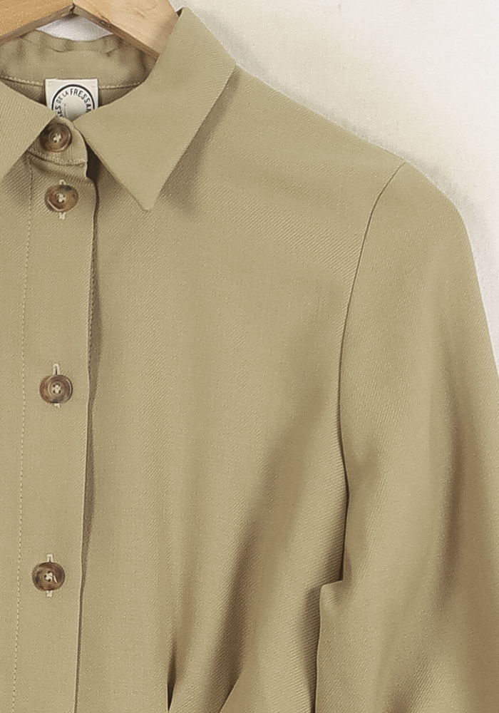 Robe chemise beige Ines de la Fressange Paris en taille S/36, à la coupe épurée et élégante. Confectionnée dans une matière fluide, cette robe se distingue par sa patte de boutonnage intégrale sur le devant, ses poignets boutonnés et sa ceinture ton sur ton qui souligne gracieusement la taille, offrant une touche sophistiquée. Idéale pour une journée au bureau ou un déjeuner en ville, elle apportera raffinement et confort à toutes vos occasions.