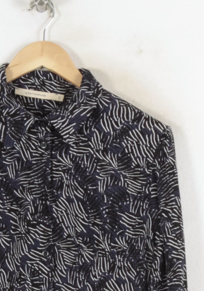 Robe La Fée Maraboutée bleu à motifs graphiques, taille XL/42, élégante et moderne. Confectionnée dans une matière fluide et légère, elle se distingue par son col chemisier, ses manches longues et son imprimé original qui en fait une pièce unique et raffinée. Idéale pour une journée de travail ou un déjeuner élégant entre amis.