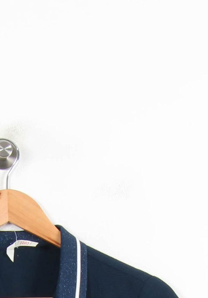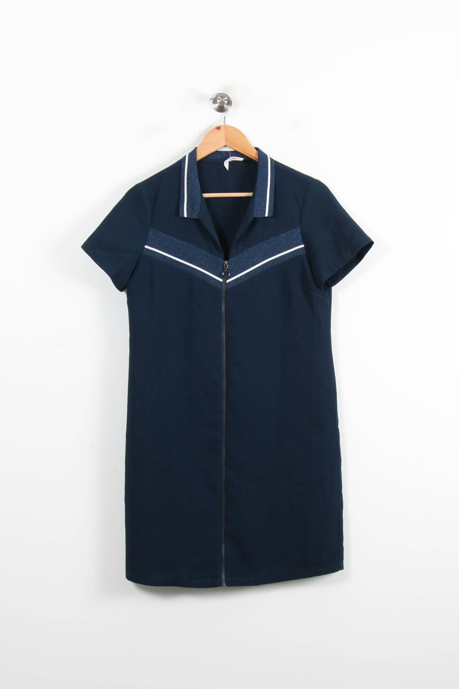 Robe bleu marine I.Code, taille M/38, à manches courtes et zip central, alliant élégance et modernité. La matière semble fluide et structurée, agrémentée de détails contrastants sur le col et la poitrine qui offrent une touche graphique et originale. Cette robe sera idéale pour une journée professionnelle ou un événement décontracté chic.