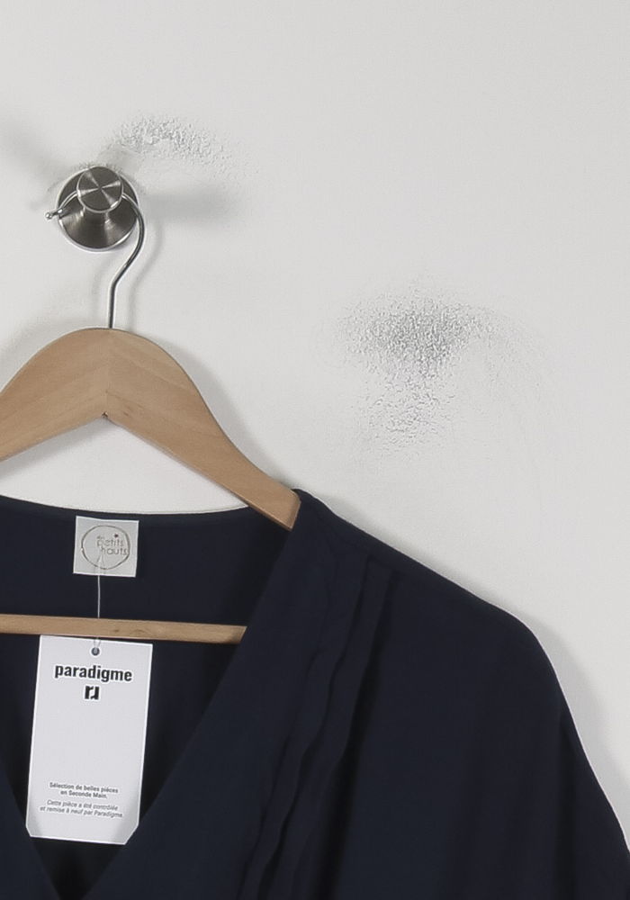 Robe bleu marine à boutons, taille M/38, par Des Petits Hauts. Cette robe se distingue par sa coupe fluide, son encolure en V et ses plis délicats sur le plastron, apportant une touche de raffinement à son allure épurée ; la matière est douce et légère, idéale pour la mi-saison. Parfaite pour une journée au bureau ou un déjeuner en terrasse, elle allie élégance et décontraction.