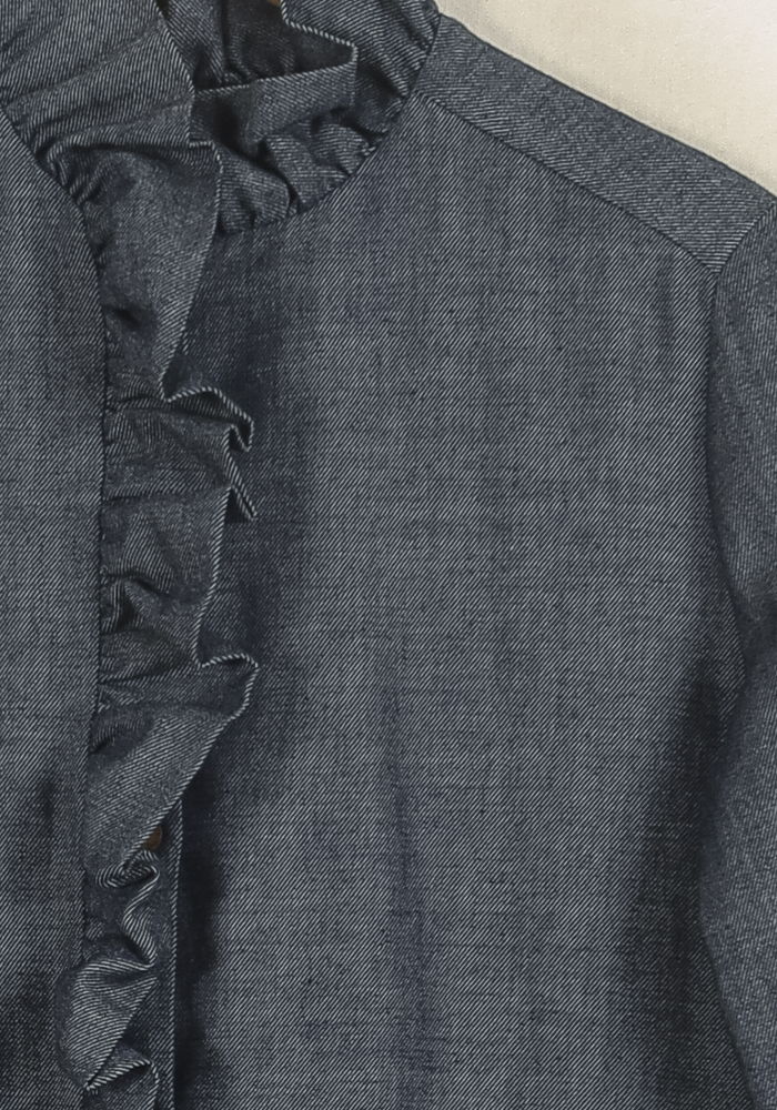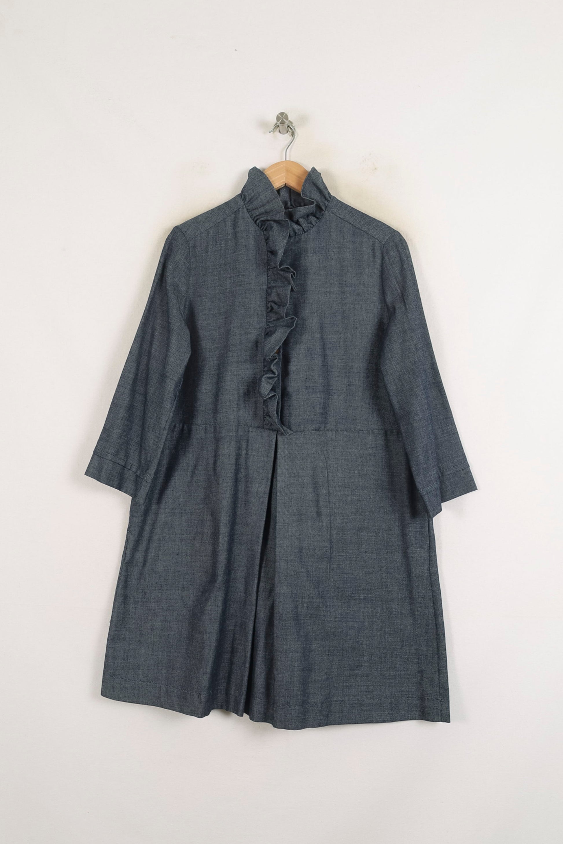 Robe bleu à col volanté Ines de la Fressange Paris, taille S/36. Confectionnée dans une matière au tombé fluide et structuré, cette pièce se distingue par son col montant et son élégante patte de boutonnage ornée de volants, offrant un style raffiné et singulier. Idéale pour une journée au bureau ou un rendez-vous décontracté, cette robe apportera une touche sophistiquée à votre tenue.