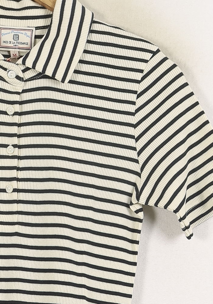 Robe polo rayée bleu marine et blanche Ines de la Fressange Paris, taille M/38, élégante et intemporelle. Confectionnée dans une maille à rayures horizontales, elle se distingue par son col polo classique, son boutonnage discret sur le buste et sa coupe longue près du corps, qui lui confèrent un style casual chic unique. Idéale pour une journée estivale en ville ou un déjeuner entre amis.