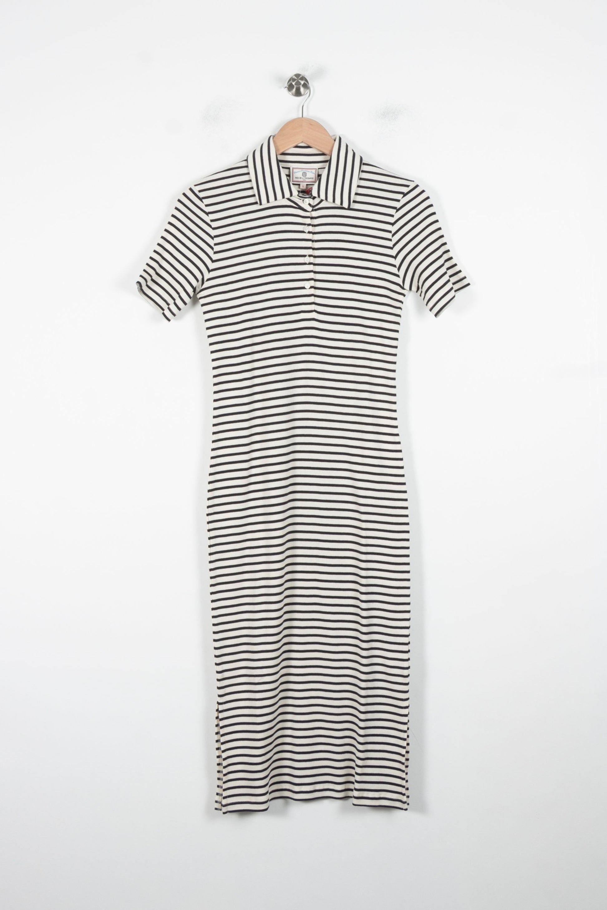 Robe polo rayée bleu de la marque Ines de la Fressange Paris, taille S/36, au style marin chic et intemporel. Confectionnée en 100% coton, cette robe se distingue par son tissu doux et respirant, ses manches courtes, son col boutonné et ses rayures élégantes qui lui confèrent une allure authentique et raffinée. Idéale pour une journée estivale en ville ou une promenade en bord de mer.