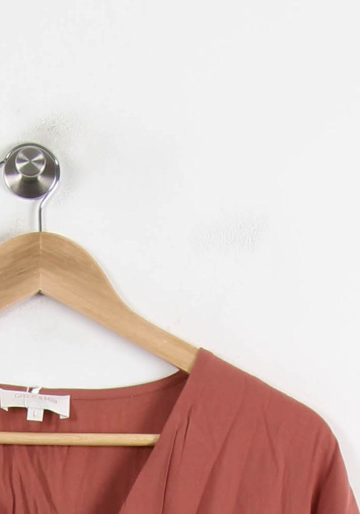 Robe Grace & Mila taille L/40, de couleur rose, à manches courtes et boutonnée sur le devant. Confectionnée dans une matière légère à l’aspect légèrement froissé, cette robe se distingue par sa ceinture intégrée à nouer à la taille et ses manches retroussées, apportant une touche décontractée et élégante. Idéale pour une journée estivale ou un déjeuner en terrasse.