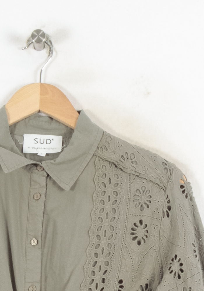 Robe Sud Express verte, taille L/40, élégante et confortable, idéale pour une silhouette féminine et moderne. Confectionnée dans une matière légère, elle se distingue par ses broderies ajourées florales sur les manches, le buste et la base, ainsi que par sa taille ajustable par un lien, apportant douceur et sophistication à l’ensemble. Parfaite pour un déjeuner printanier ou une sortie en ville sous le signe du raffinement et de l’aisance.