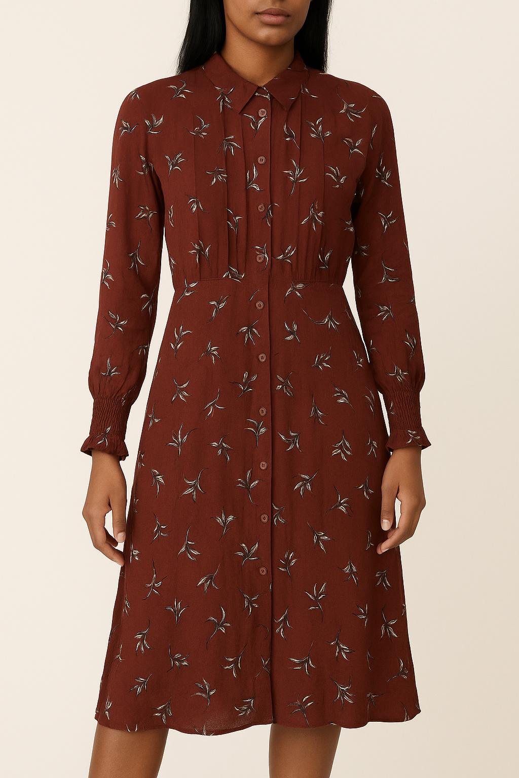 Robe longue bordeaux à motif floral de la marque ba&sh, taille S/36. Confectionnée dans une matière fluide, cette robe se distingue par sa rangée de boutons sur le devant, son col chemise, ses manches longues à poignets smockés et son imprimé délicat qui lui confère une note d’élégance intemporelle. Idéale pour une journée au bureau ou un déjeuner chic entre amies.