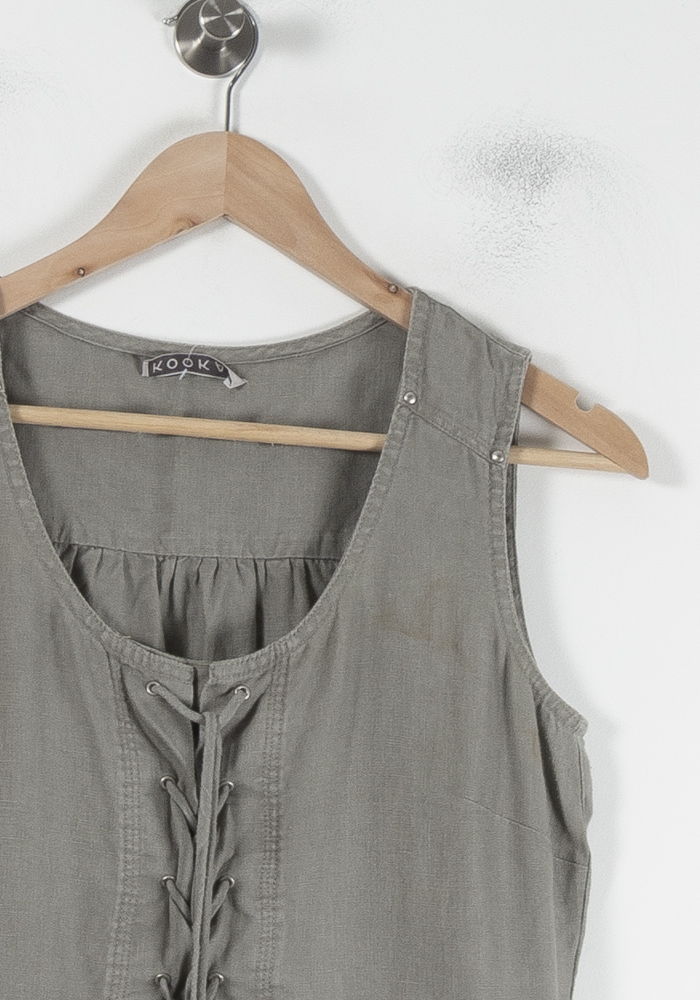Robe sans manches grise Kookai, taille M/38, au style épuré et féminin. Confectionnée en 100% lin, cette pièce se distingue par son laçage élégant sur le devant et ses poches discrètes, conférant à la fois confort et raffinement. Idéale pour une journée estivale ou un brunch décontracté, elle incarne la simplicité chic.