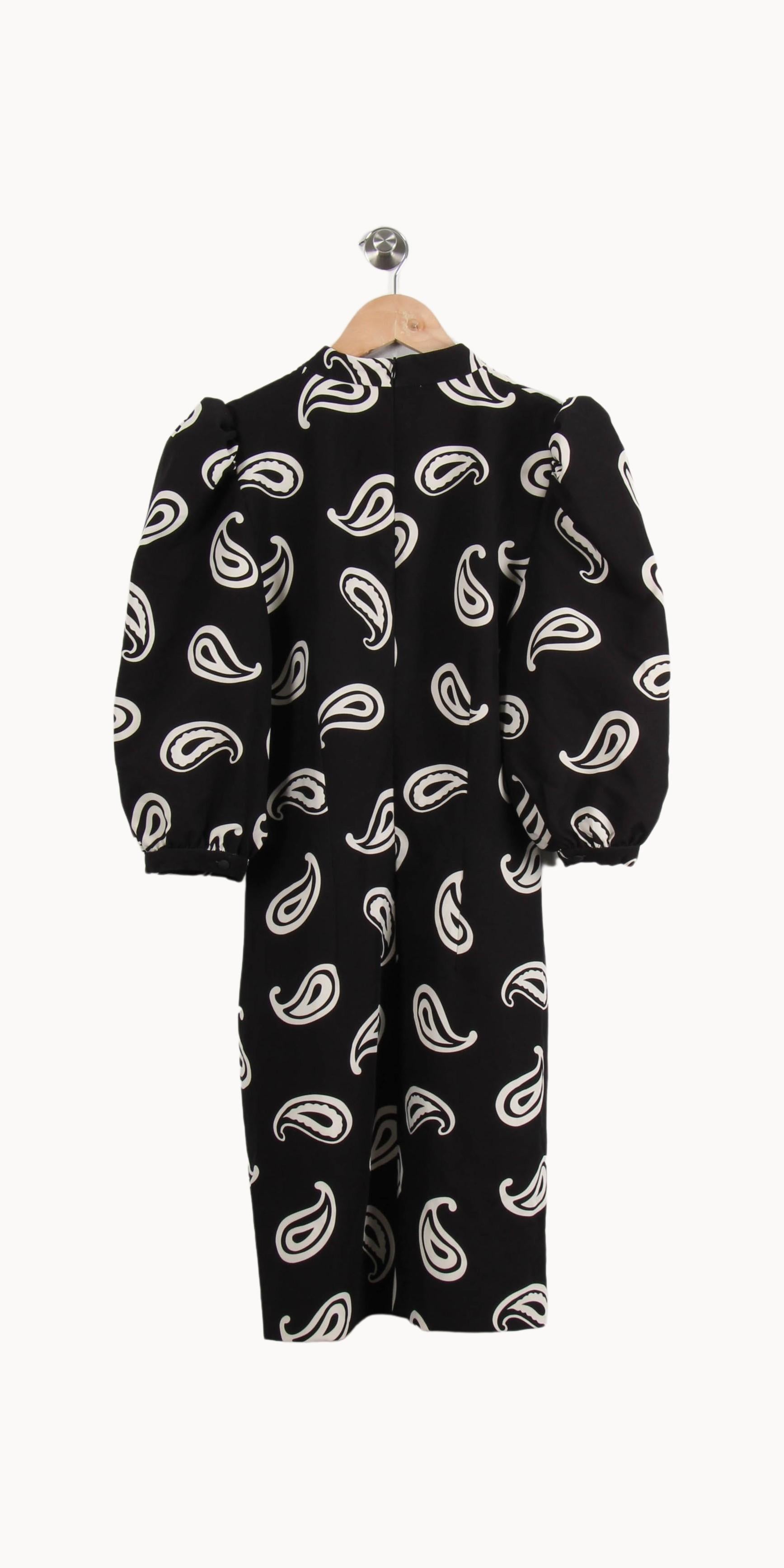 Robe noire Galeries Lafayette taille M/38, à imprimé motif cachemire blanc, manches mi-longues légèrement bouffantes. La matière souple et le motif cachemire contrasté apportent une touche d’originalité et d’élégance à cette pièce, tandis que la coupe droite et les finitions soignées soulignent la qualité du vêtement. Idéale pour une sortie entre amis ou un événement semi-formel où vous souhaitez allier sophistication et confort.