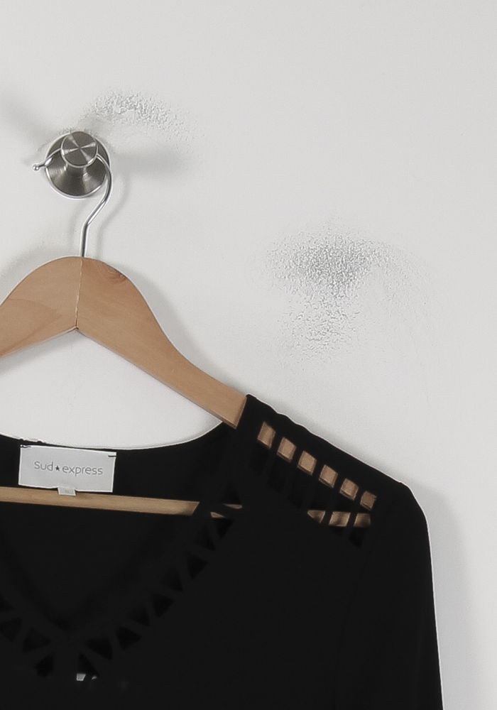 Robe noire Sud Express en taille S/36, élégante et intemporelle, dotée de manches longues et d’un décolleté en V orné de découpes graphiques. Confectionnée en tissu principal 100% polyester avec doublure intégrale, cette robe se distingue par ses détails ajourés raffinés au niveau des épaules et de l’encolure, apportant une touche subtile de modernité. Idéale pour une soirée habillée ou un dîner en ville, cette pièce assure une allure chic et sophistiquée.