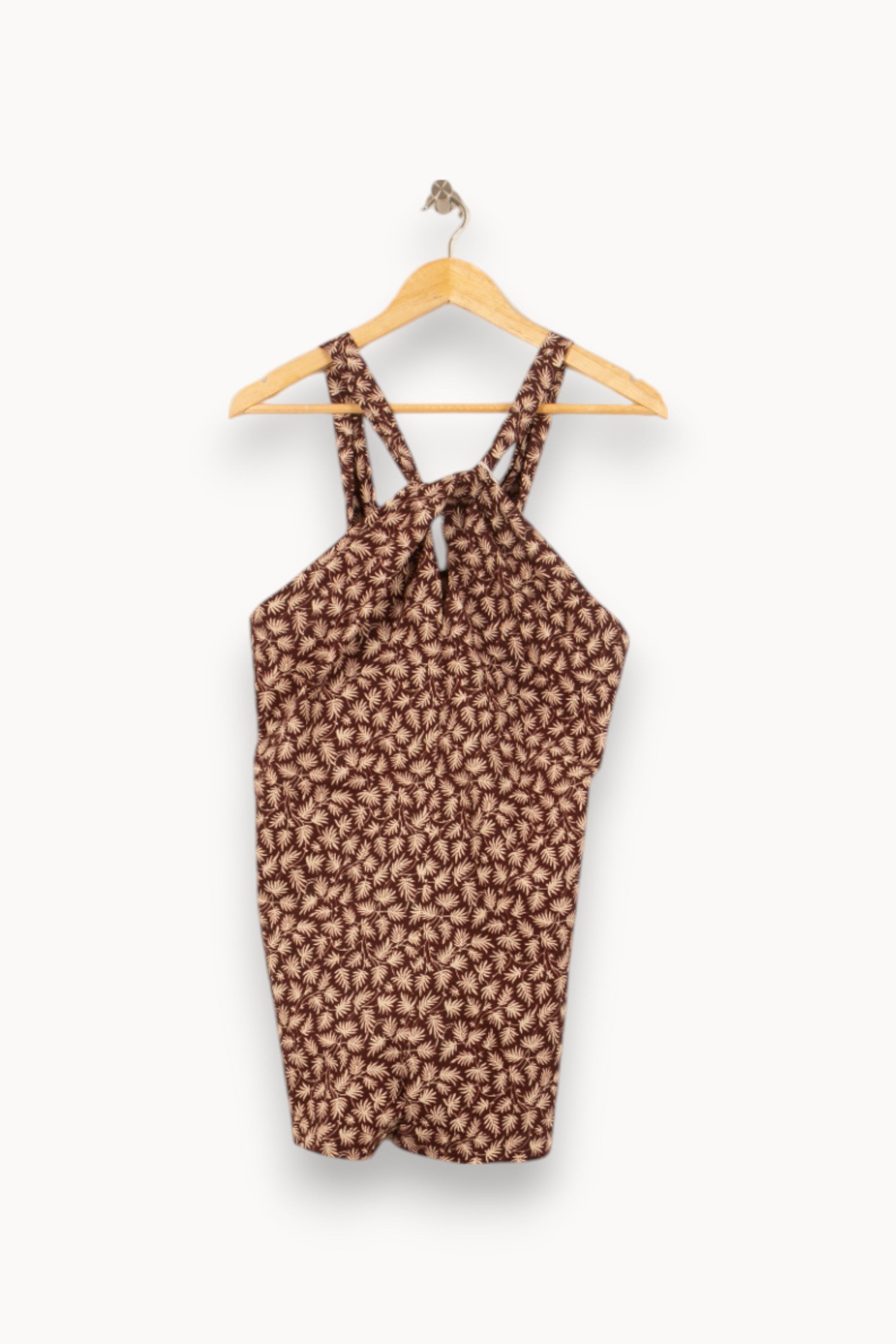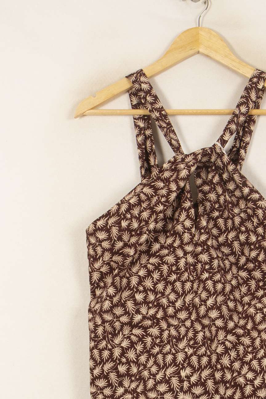 Robe Vanessa Bruno, taille S/36, de couleur marron à motif floral. Confectionnée dans une matière fluide, cette robe se distingue par son imprimé végétal raffiné et ses bretelles croisées au niveau du décolleté, apportant une originalité élégante à la silhouette. Idéale pour une journée estivale ou une soirée décontractée entre amis.